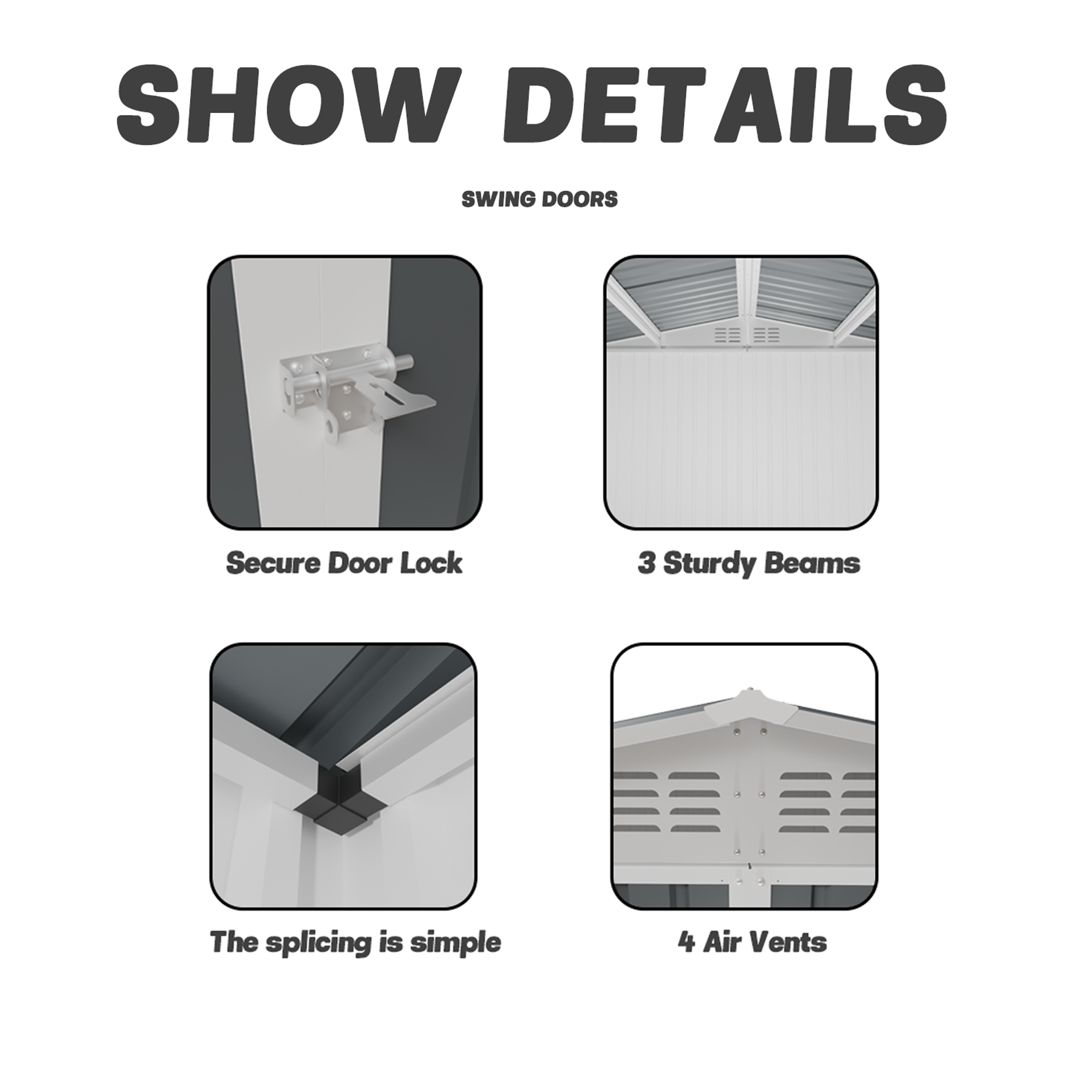 Product Name:10x8 Feet White Color Outdoor Garden Shed Aluminum alloy frame With Hinge Door and foundation