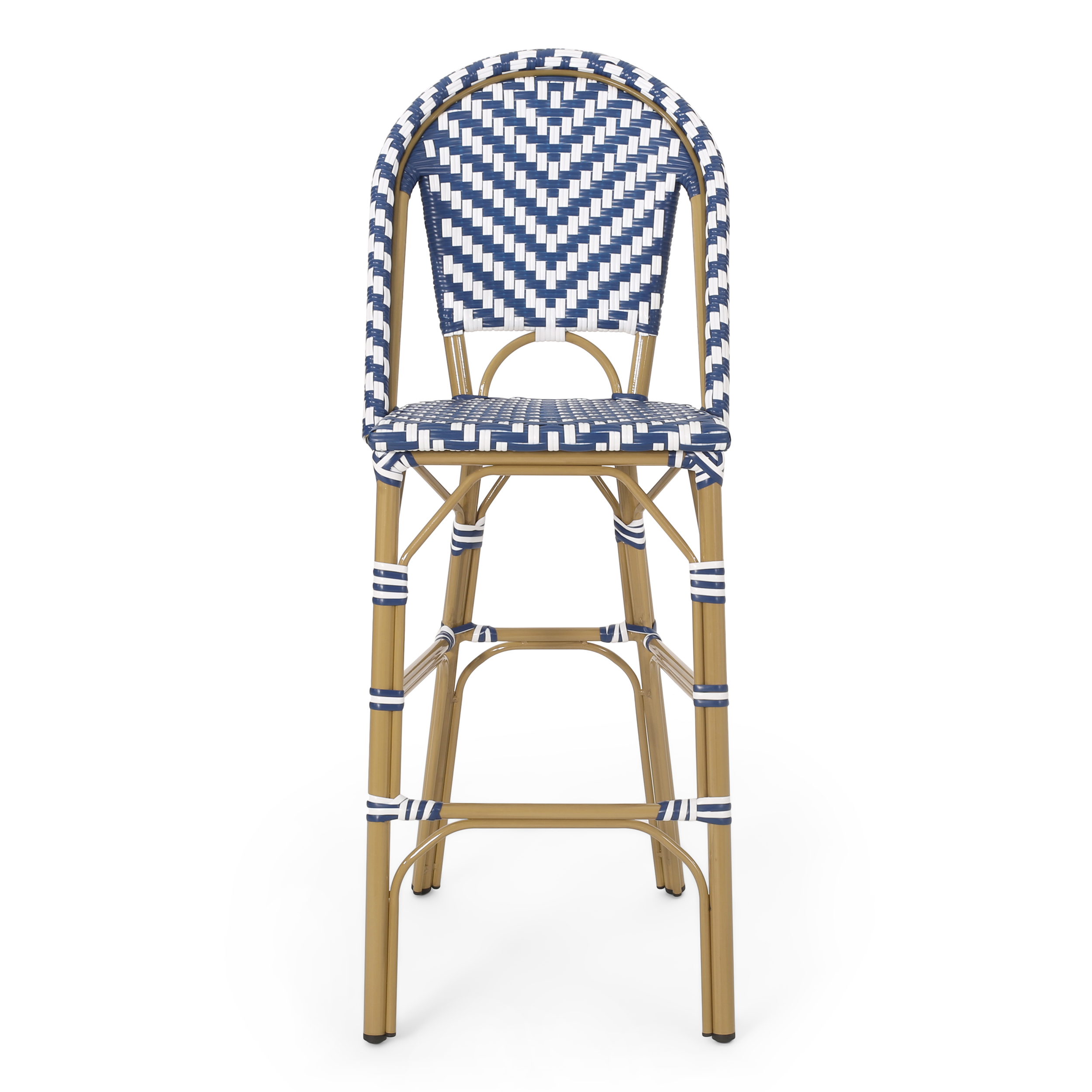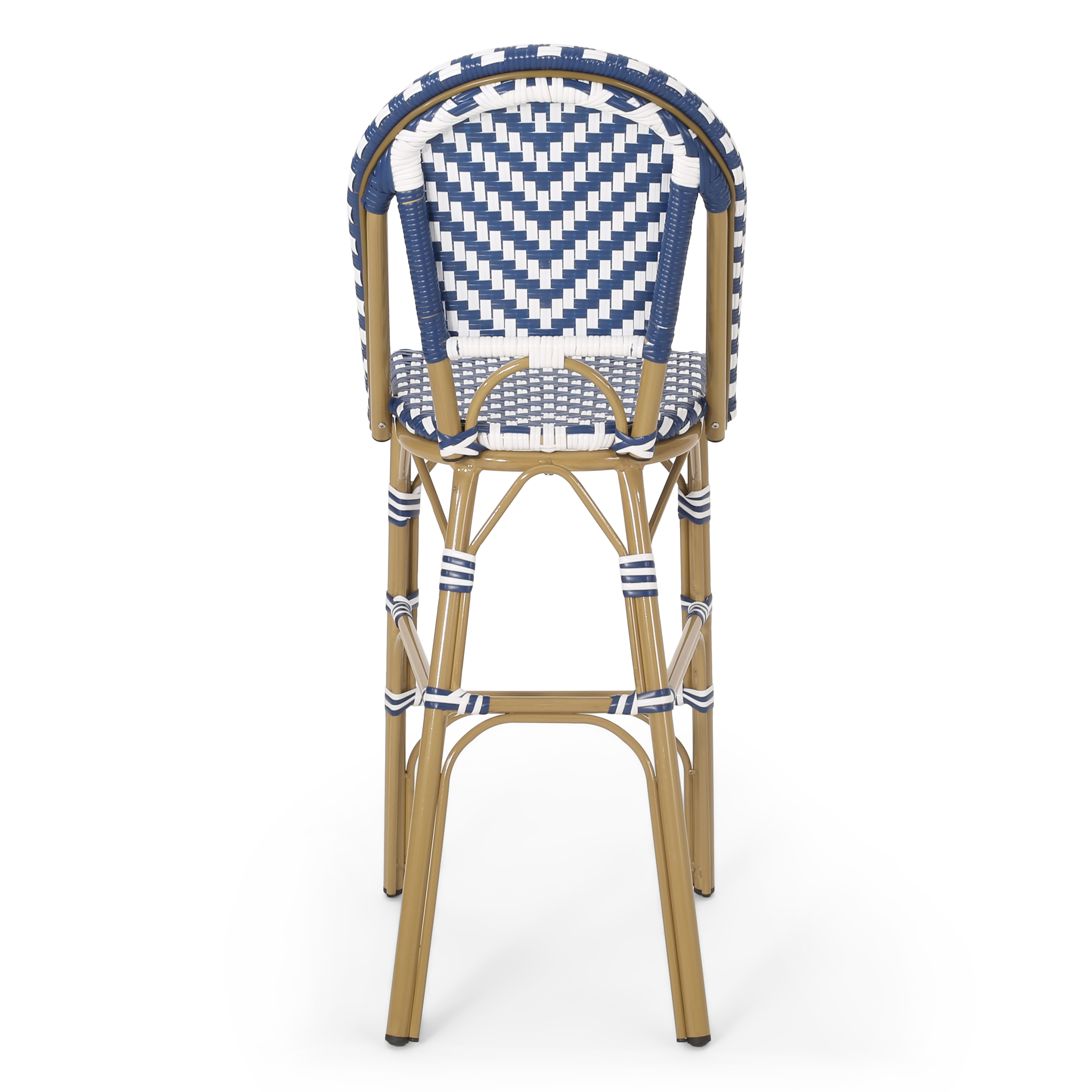 29.5 Outdoor PE Rattan French Barstool, Navy Blue And White, Aluminum Frame With Bamboo Finish Set Of 2
