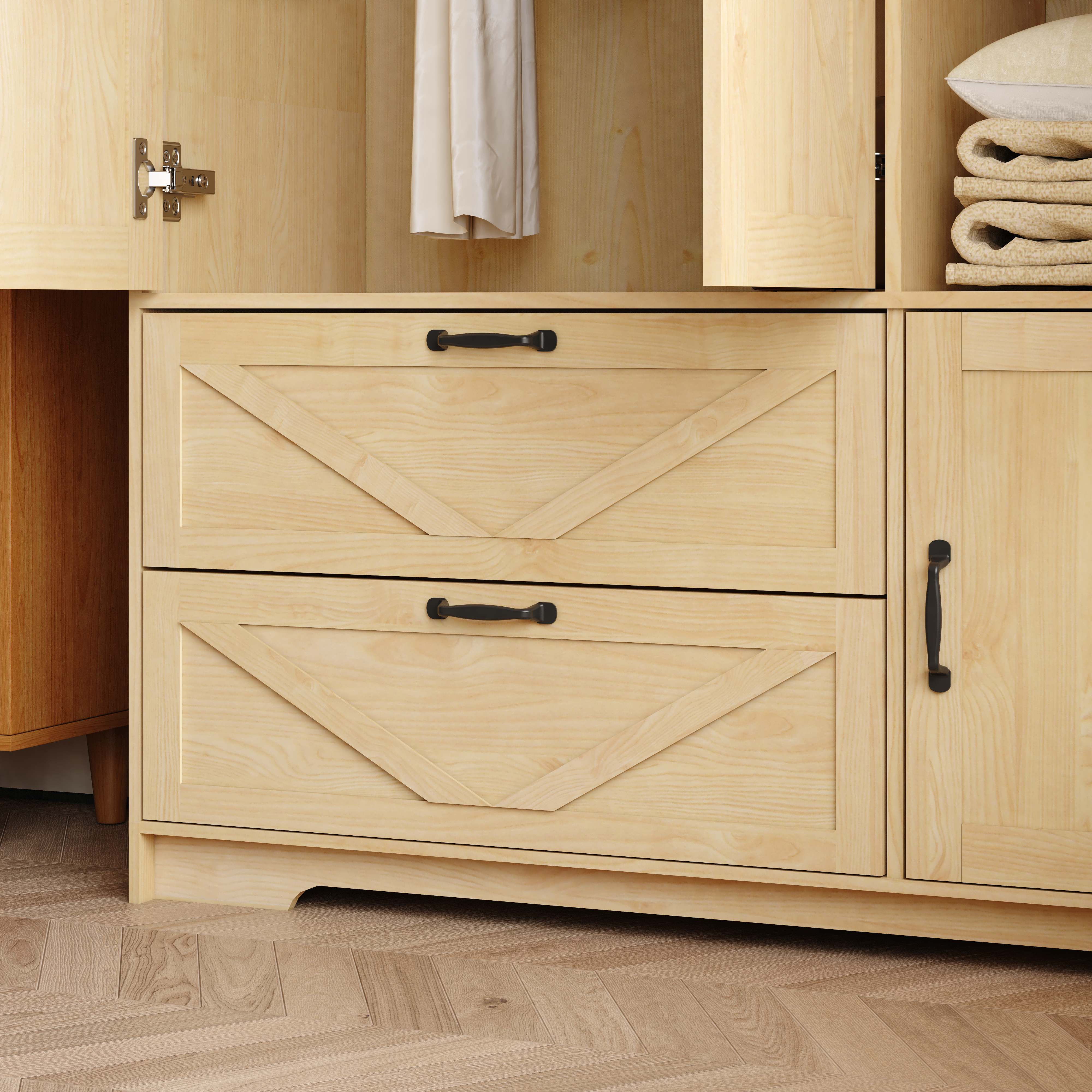 • 4 door wardrobe closet: Our natural modern wardrobe closet is divided into hanging area, stacking area and privacy area, and is equipped with 1 Automatic Motion Sensor Light to add charm to your bedroom