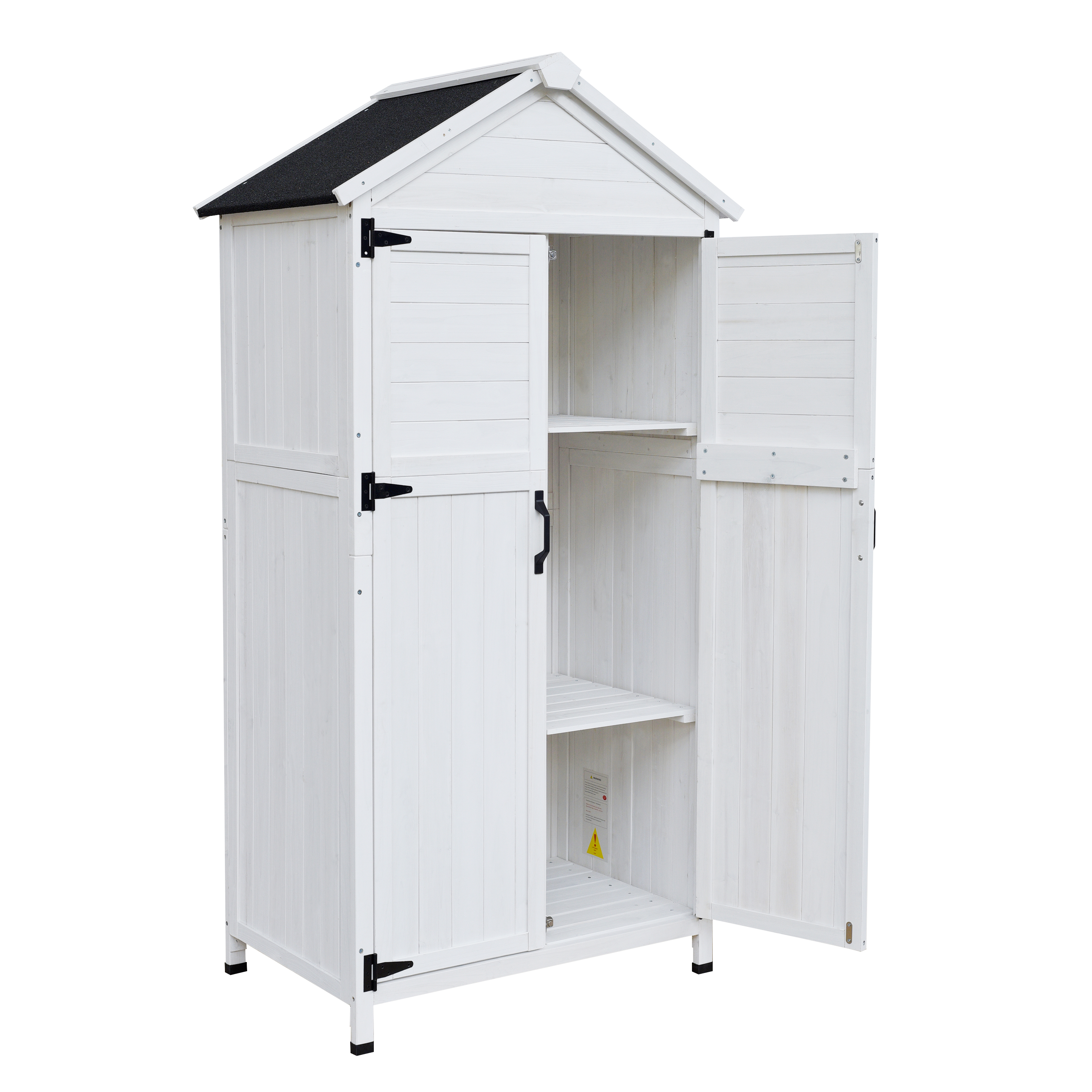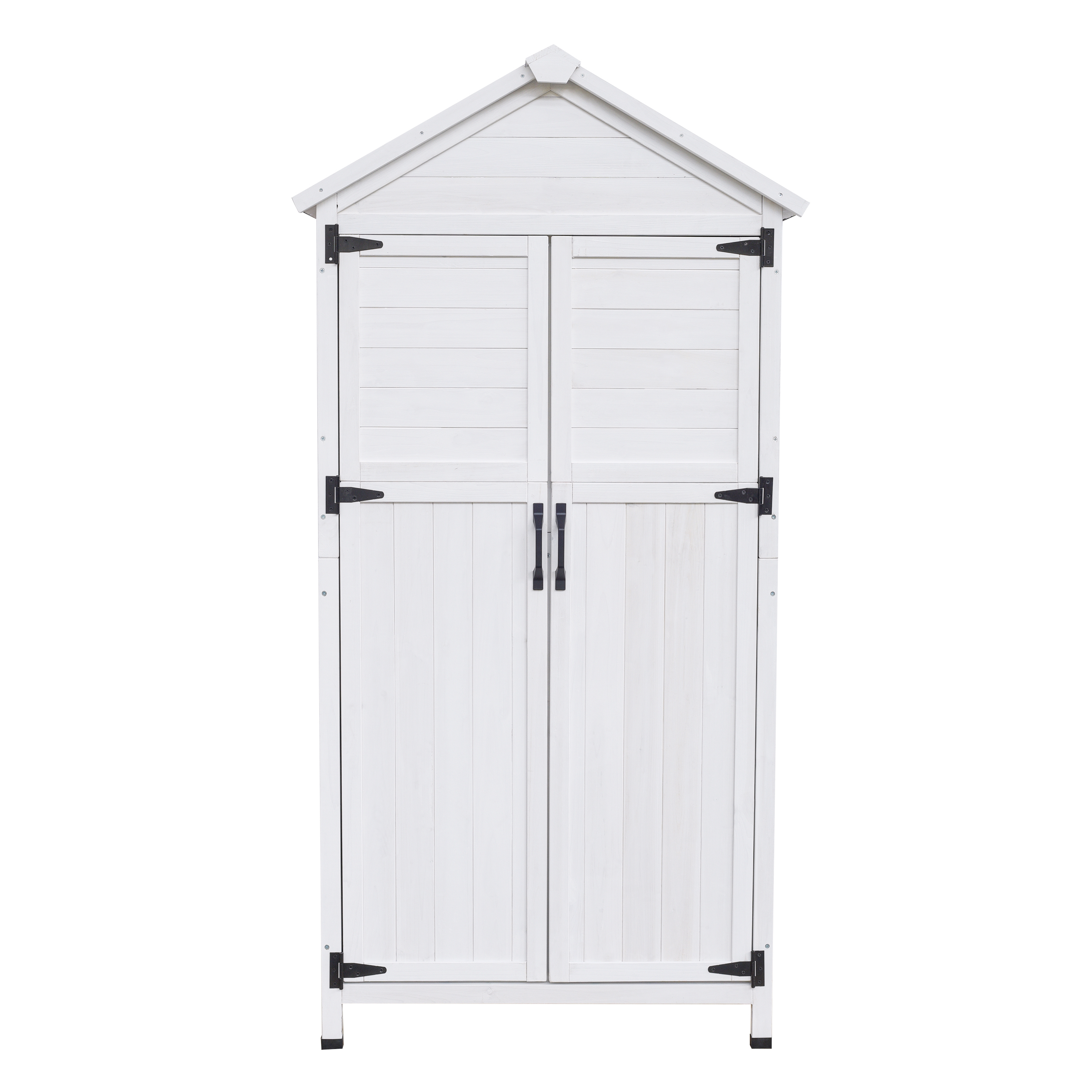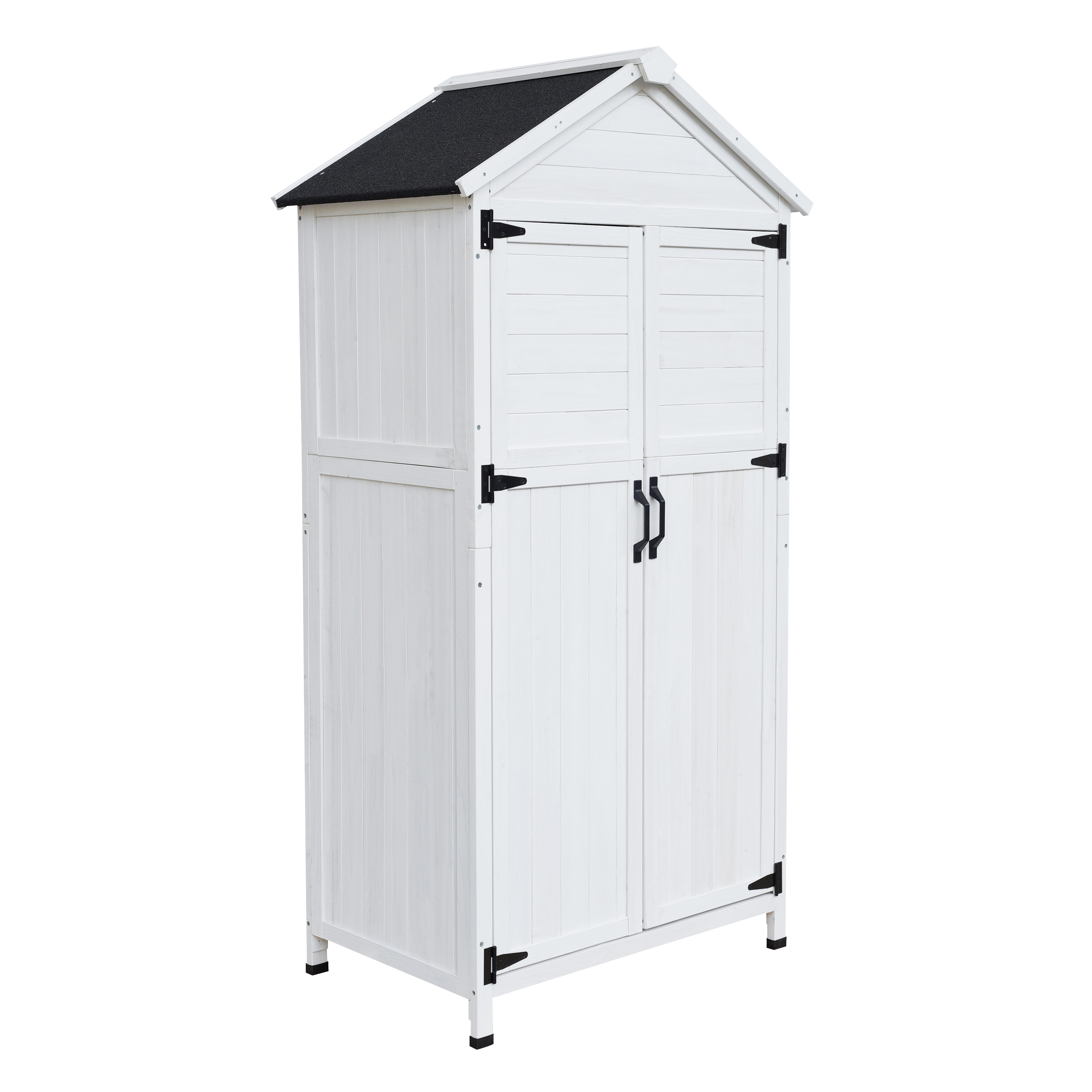 • Spacious White Storage ShedCrafted from durable fir wood, this 67-inch-tall shed features a bright white finish that blends seamlessly with outdoor spaces while providing ample storage capacity for garden tools and equipment.