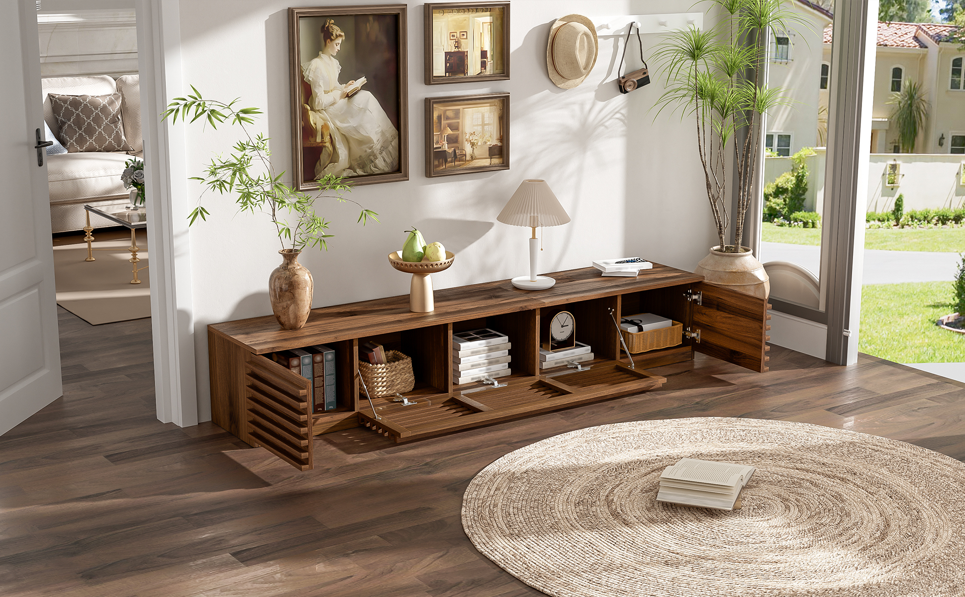 This floor-standing media console offers organized functionality with thoughtful details. The flip-up door, finished with a subtle wave-pattern texture, conceals ample hidden storage to reduce clutter. Its wide desktop provides generous display space, while integrated cable ports and soft-close hinges ensure tidy wires and quiet, smooth operation—all designed for stylish, everyday convenience.