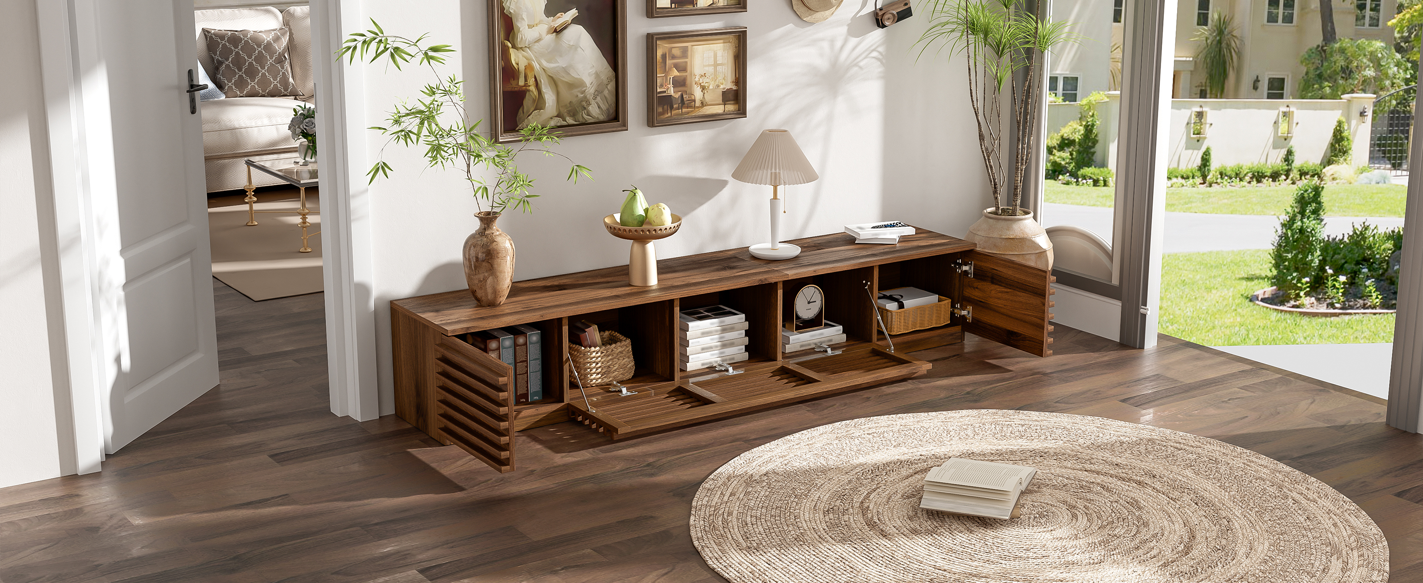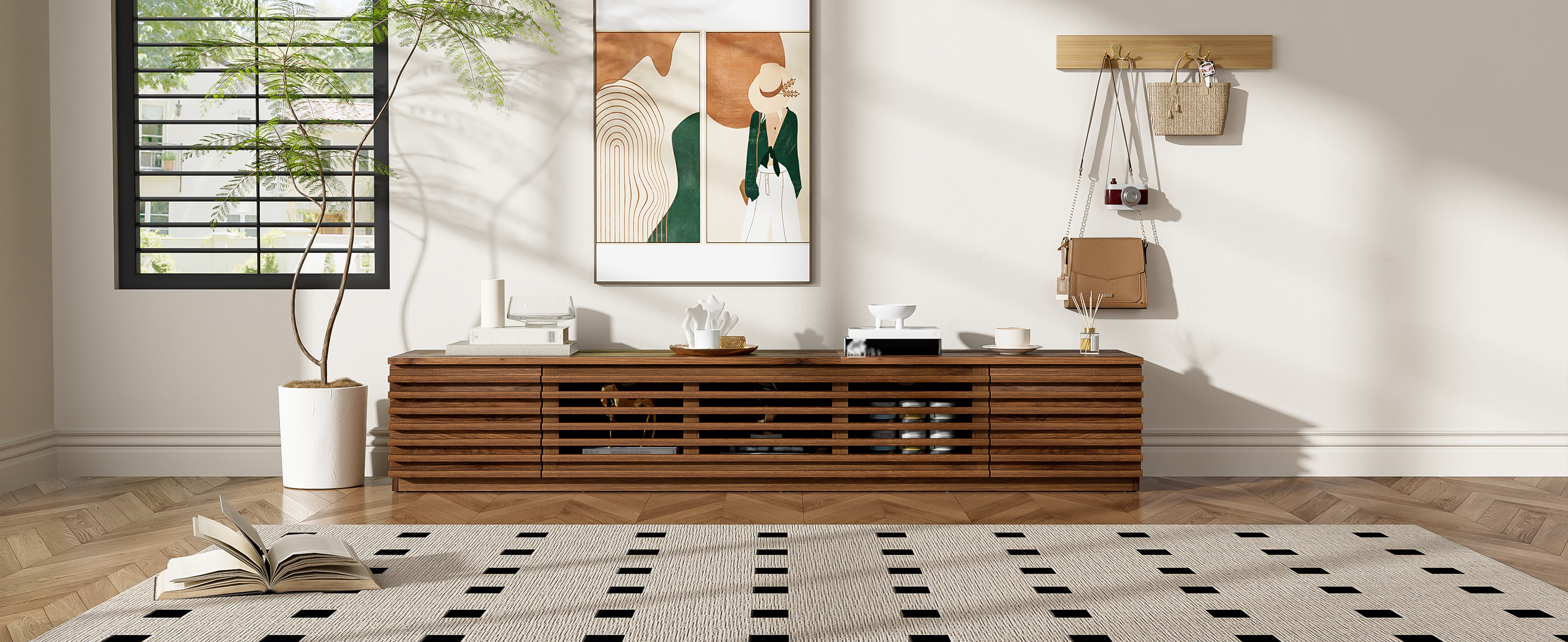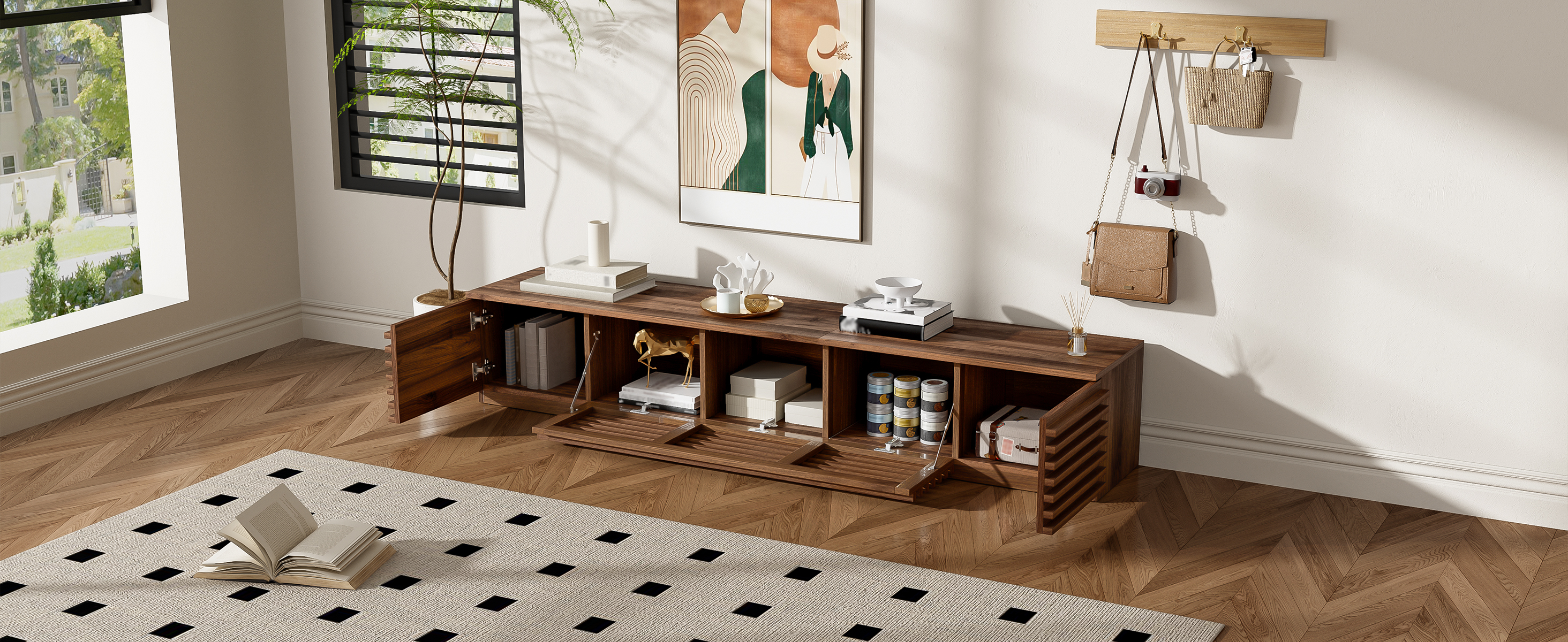 • [Thoughtful Functional Details] Crafted with clean horizontal-line doors and natural wood-grain finish, this console adds modern texture to your space. Integrated cable ports keep wires organized and out of sight, while soft-close hinges ensure smooth, silent operation. Thoughtfully designed to blend refined style with everyday function, it’s the practical yet polished centerpiece your entertainment setup deserves.