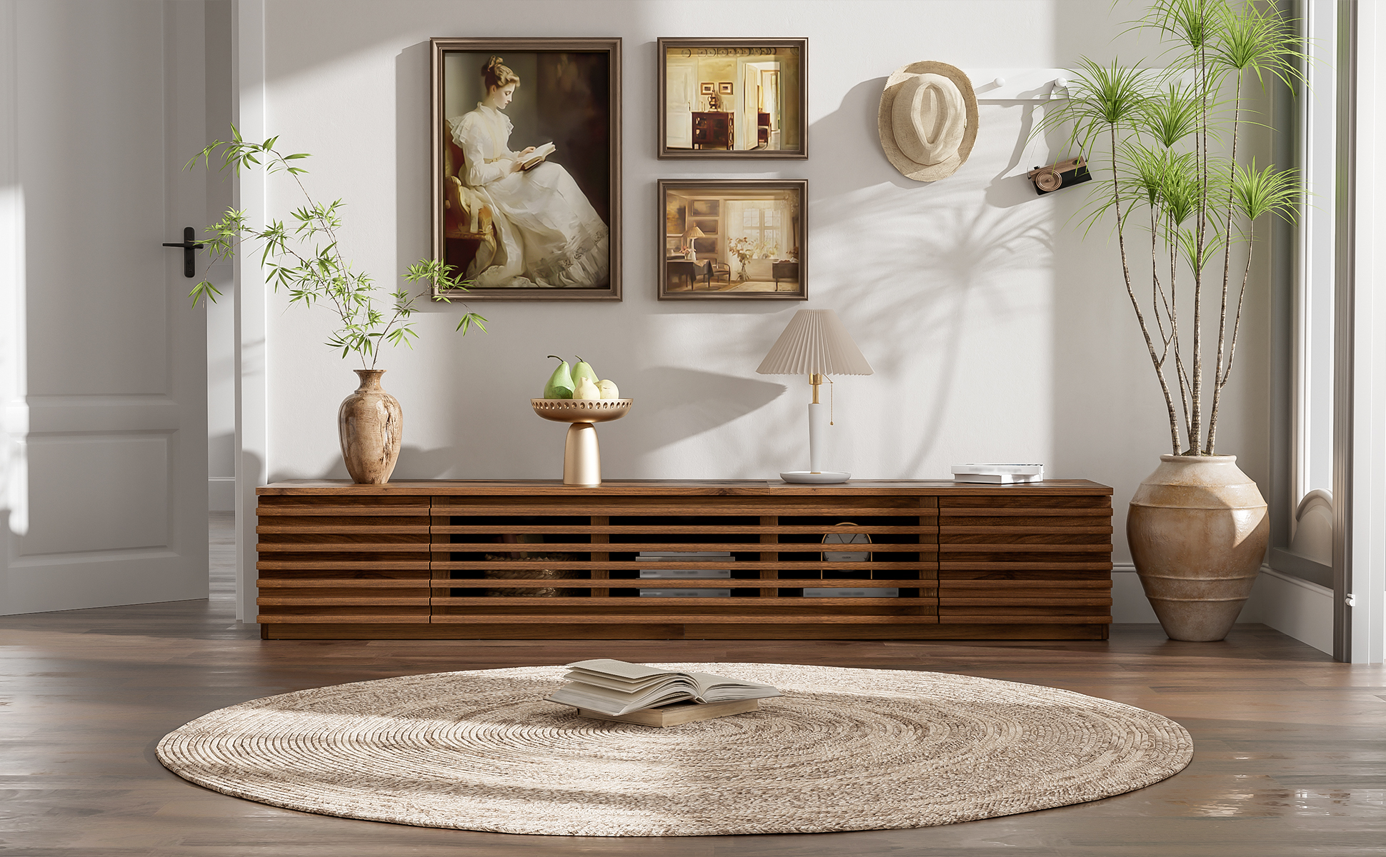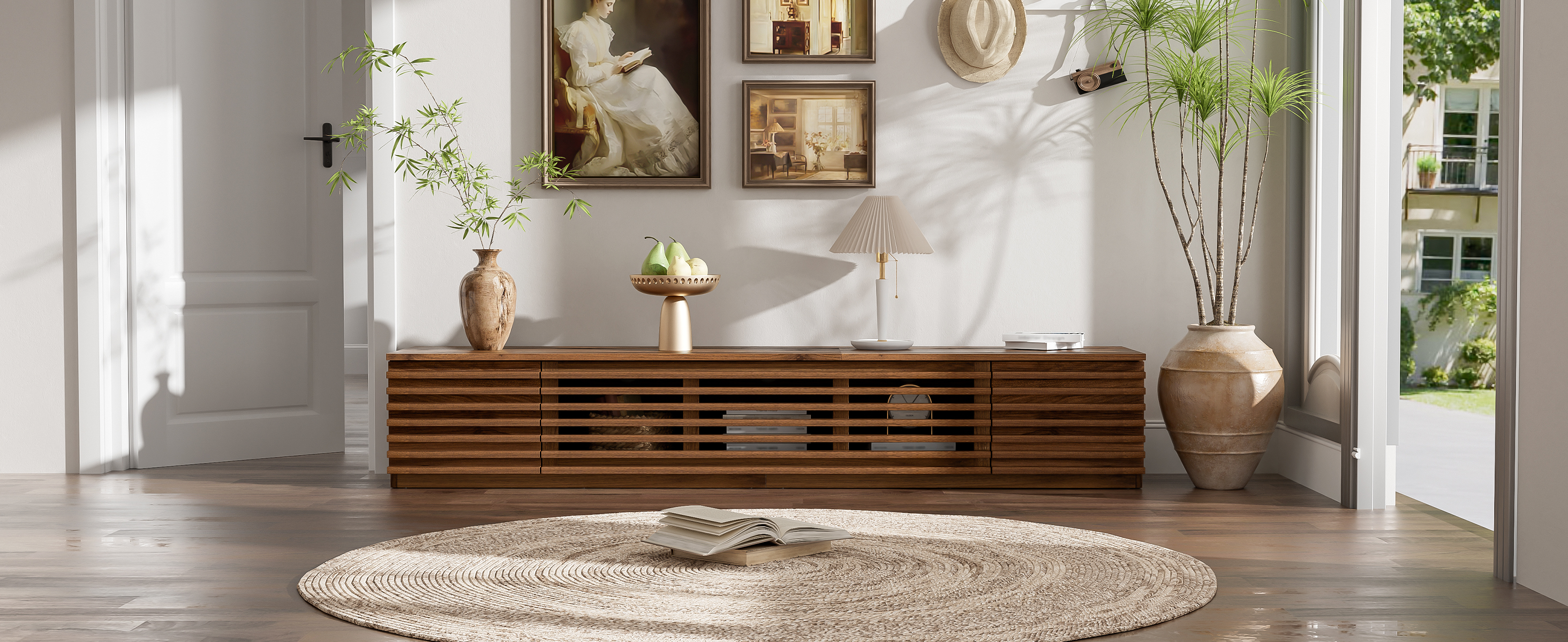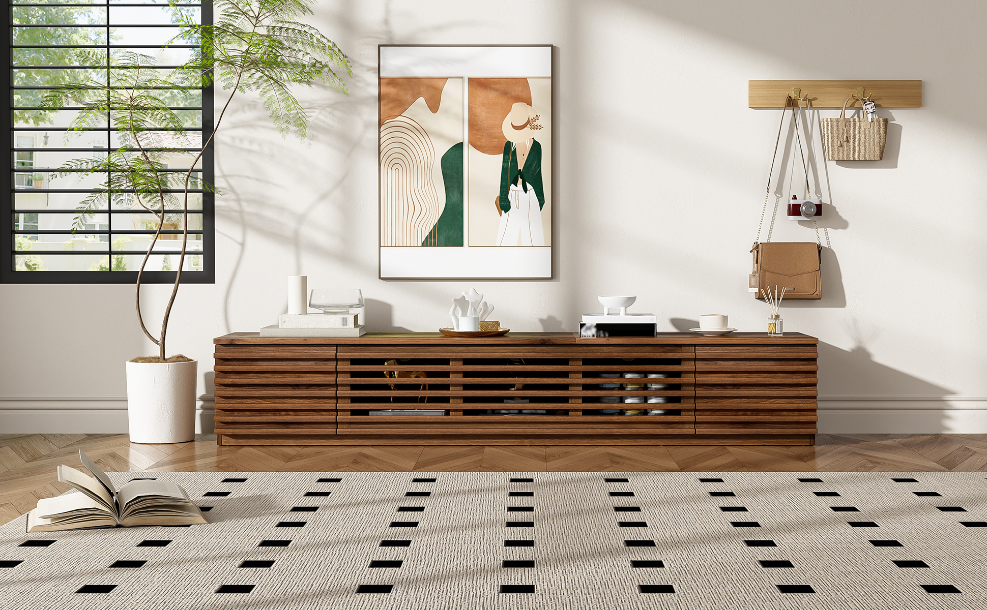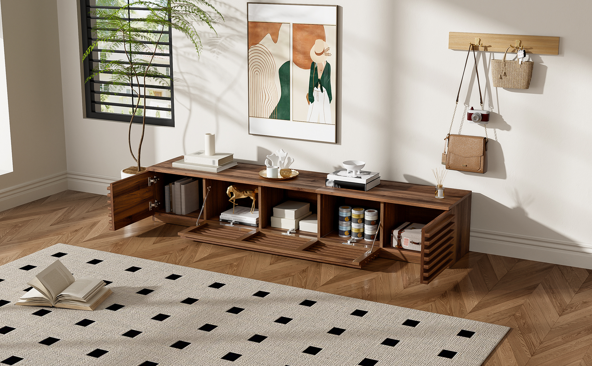 • [Thoughtful Functional Details] Crafted with clean horizontal-line doors and natural wood-grain finish, this console adds modern texture to your space. Integrated cable ports keep wires organized and out of sight, while soft-close hinges ensure smooth, silent operation. Thoughtfully designed to blend refined style with everyday function, it’s the practical yet polished centerpiece your entertainment setup deserves.