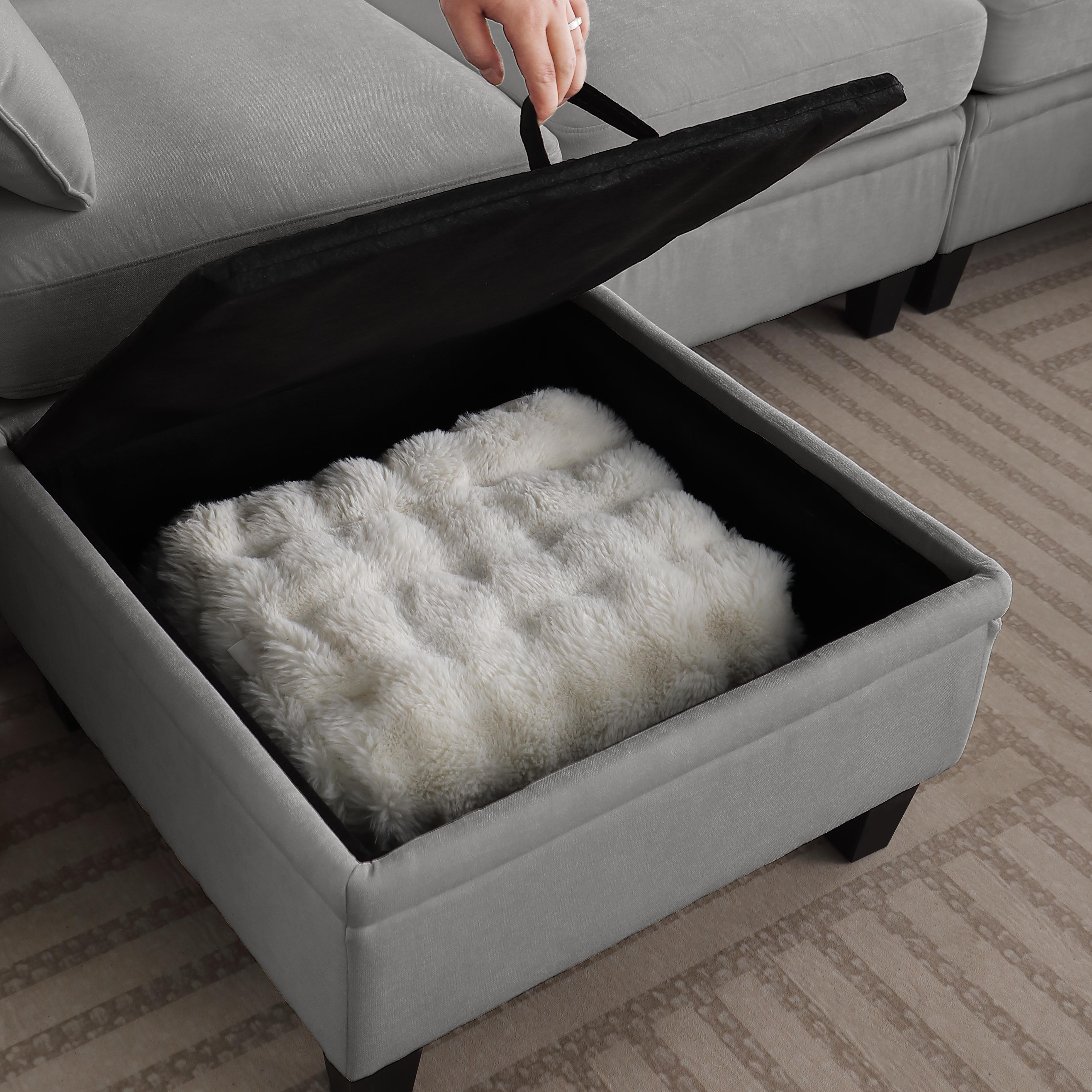 • Equipped with a handy multi-purpose storage ottoman, this sofa lets you tailor your seating setup exactly how you like it. Use it as a footrest, extra seat, or even a chaise extension — you’ll get the coziest, most relaxing lounging experience ever.