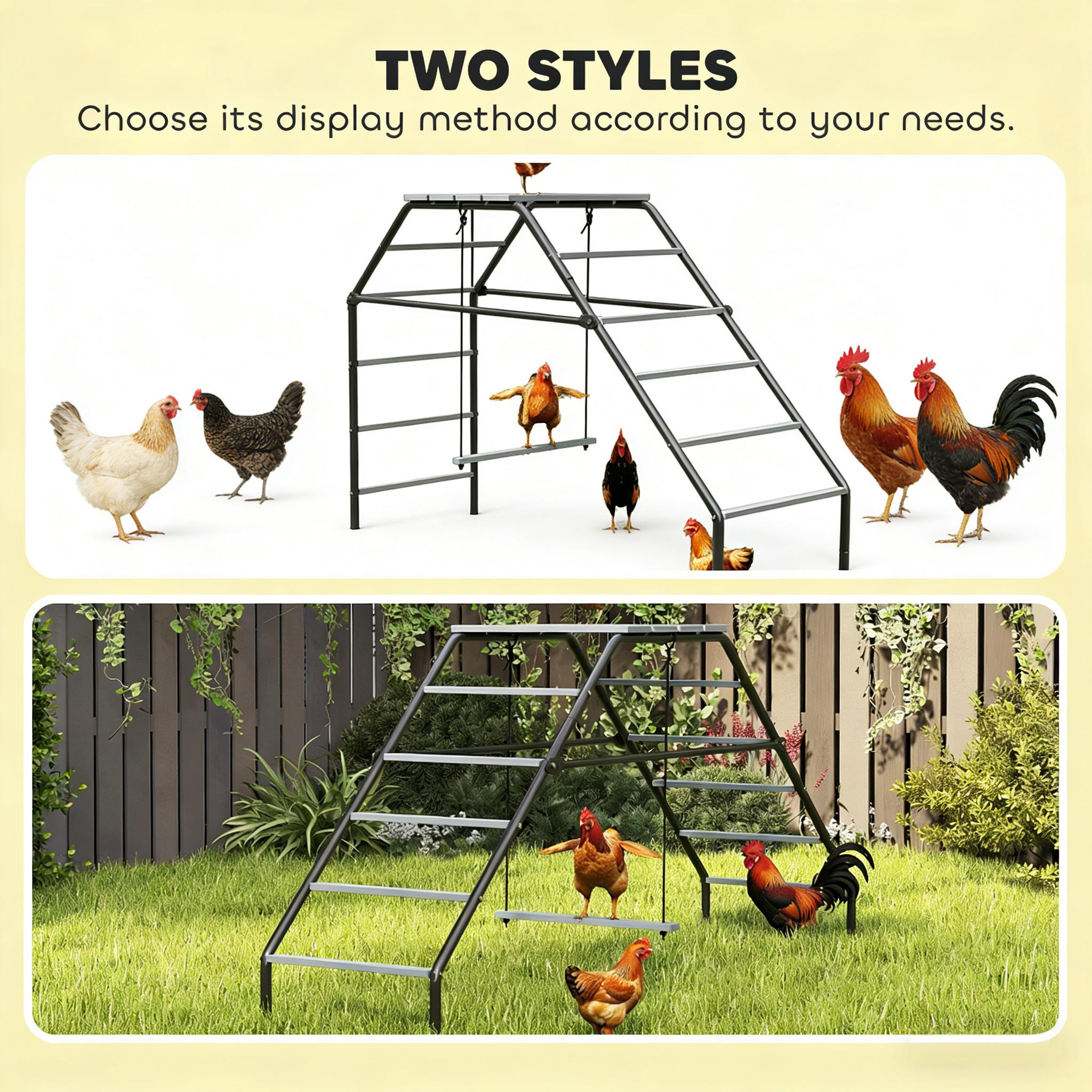 Features: - This unique chicken perch converts into two shapes to fit your yard - Features 10 perches, an adjustable swing, and a top platform for fun - Encourages natural behaviors like climbing and jumping, keeping two to five chickens active and healthy - Made with powder-coated steel tubes and weather-resistant fir wood for outdoor durability - Assembly required Specification: - Color: Black, Gray - Material: Fir Wood, Steel - Overall Dimensions: 59.1" W x 15.7" D x 28.3" H - Platform Dimensions: 12.8" W x 15.7" D - Swing Dimensions: 14.2" L - Perch Dimensions: 14.2" L - Weight Capacity: 11 lbs. (Perch), 33 lbs. (Platform) Package Includes: - 1 x Chicken Activity Shelf - 1 x Swing - 1 x Manual