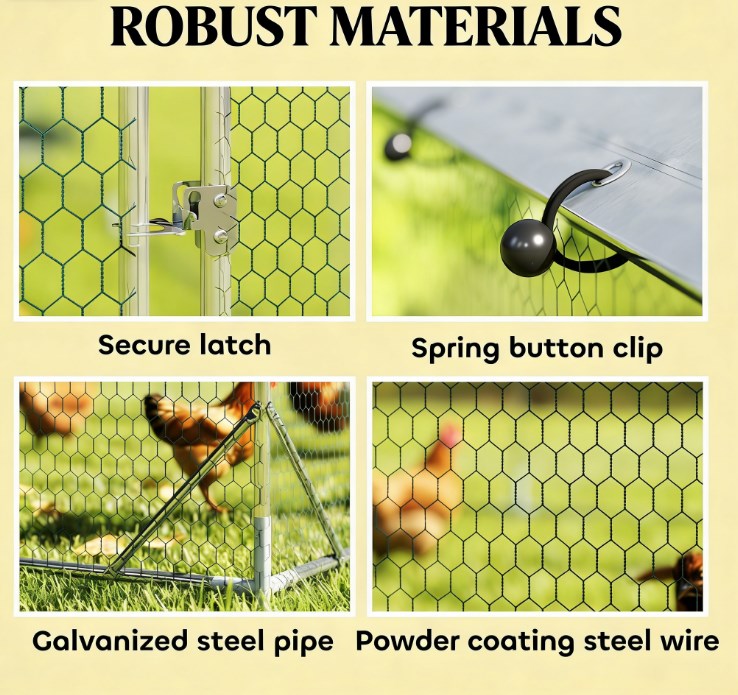 • - Reliable Materials: Made with a 1" galvanized steel and plastic-coated steel wire mesh, the small hexagonal mesh fence of this outdoor chicken coop provides protection for your chickens while outdoors, giving them a safe living space to roam