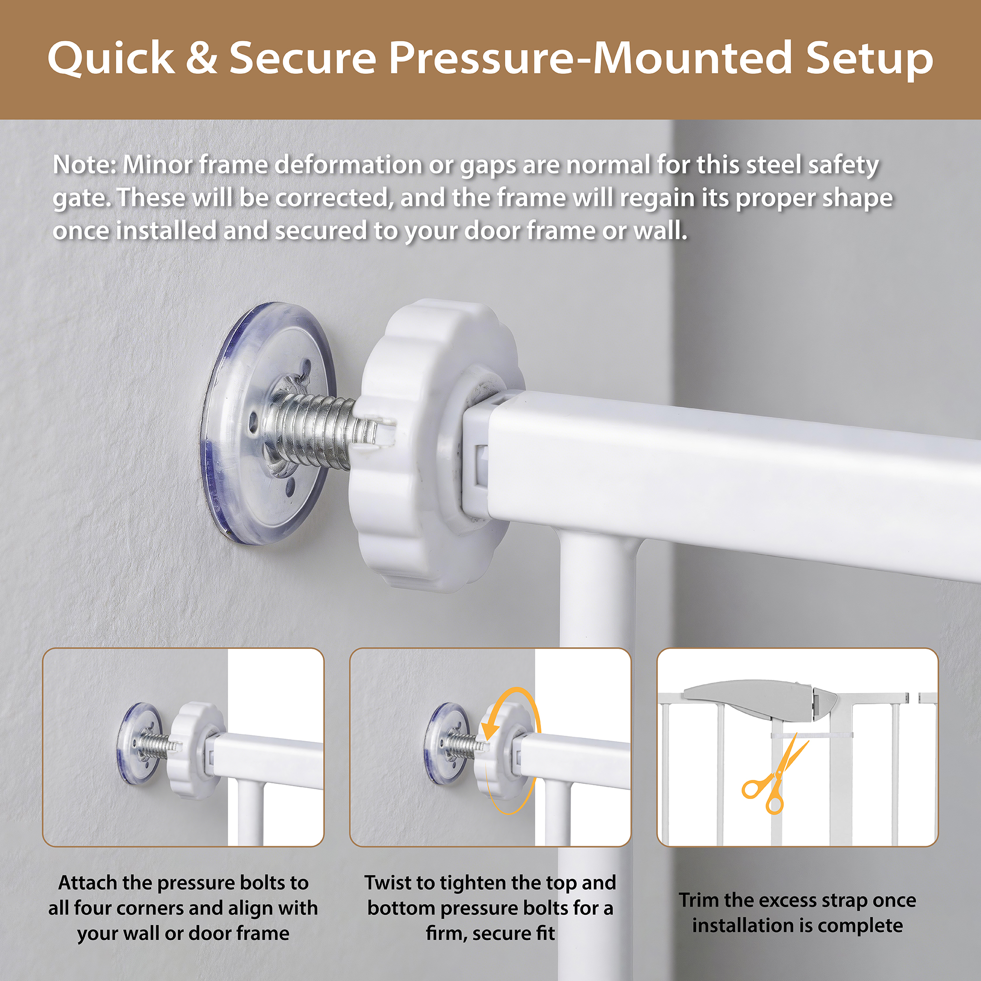 • 【Easy to install】This pressure-mounted baby gate requires no drilling, hardware or tools for installation. One person can easily set it up in just 5–10 minutes. It’s ideal for stairs, doorways and banisters, and can be quickly removed and moved to other locations as needed.