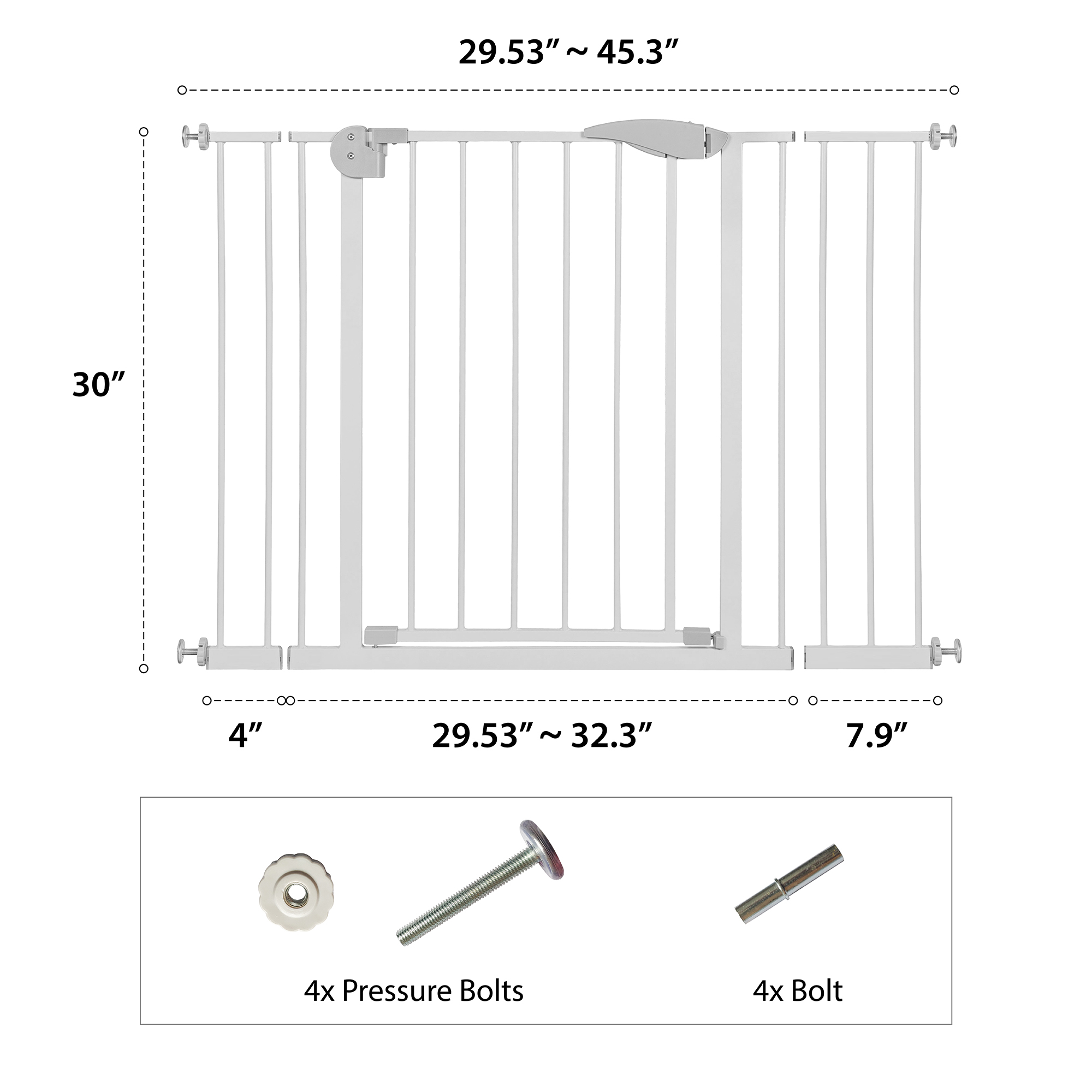• 【Extra wide】Expands to fit openings between 29.5"-45.3" width with 4" and 8" extension kits (Note: not fit openings between 31.8-33.4 Inch and 38.7-40.3 Inch), please be sure measure your opening before purchase to ensure proper fit. This baby gate is perfect for stairs, kitchen, hallway and doorways