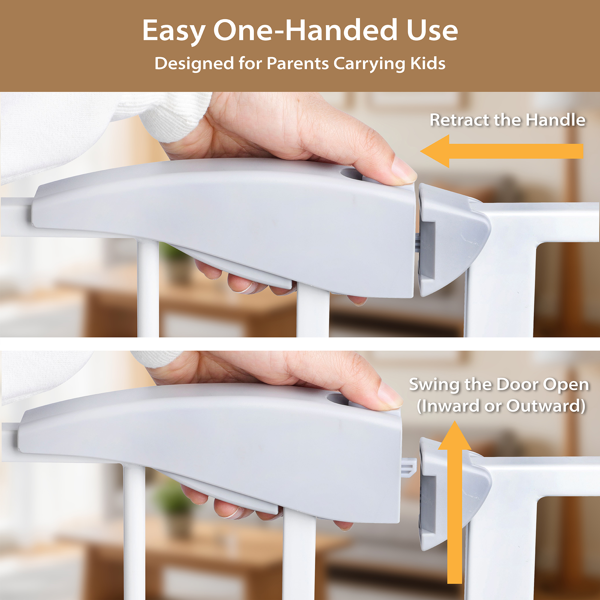 • 【Auto-close】This convenient walk-through baby gate comes with an auto-close function. It will automatically close when opened under 90°, helping reduce the risk of accidents for dogs and babies due to a forgotten open door. The gate swings both directions and can be easily opened with just one hand.