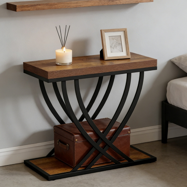 Industrial Charm - The combination of a natural wood-grain top and geometric black metal frame adds vintage-inspired charm to any modern or farmhouse-style room.
