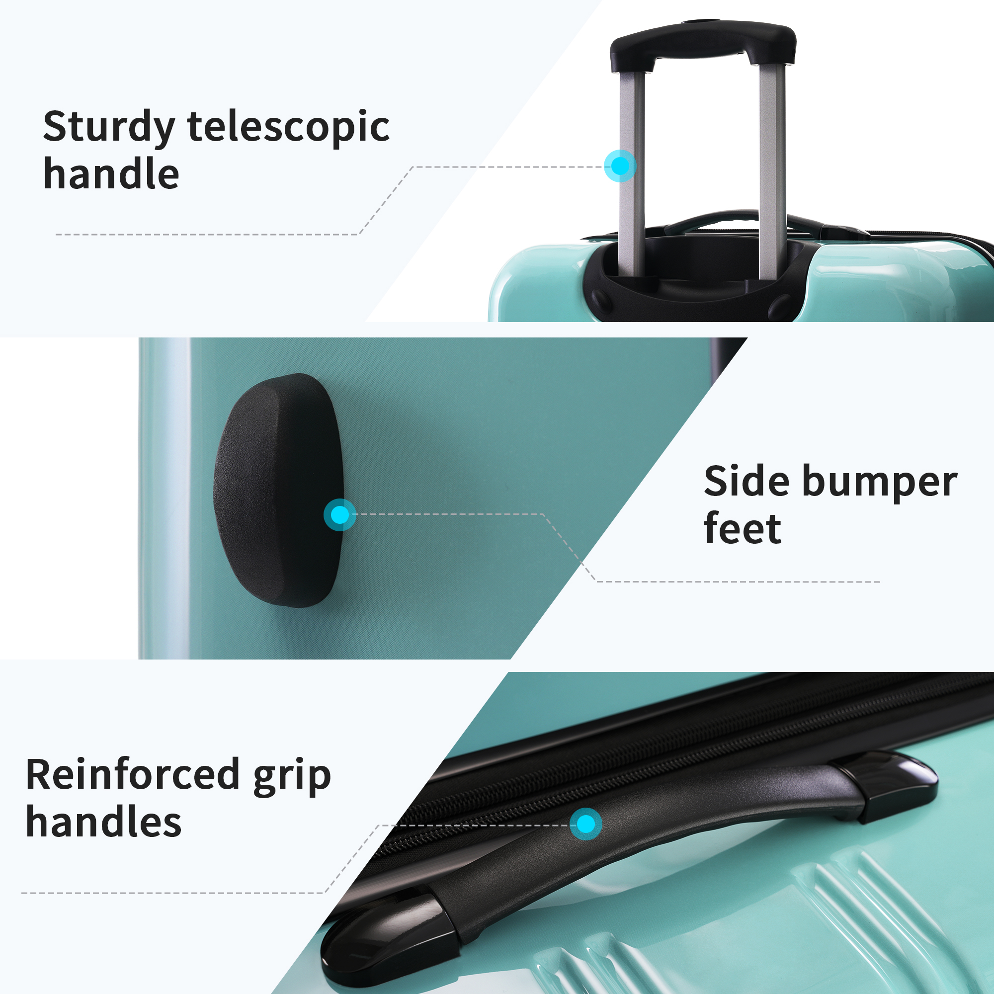• Material: These luggage sets with wheels are made from high tenacity PC material, harder and more resistant to pressure, effectively reducing damage caused by collisions during travel.