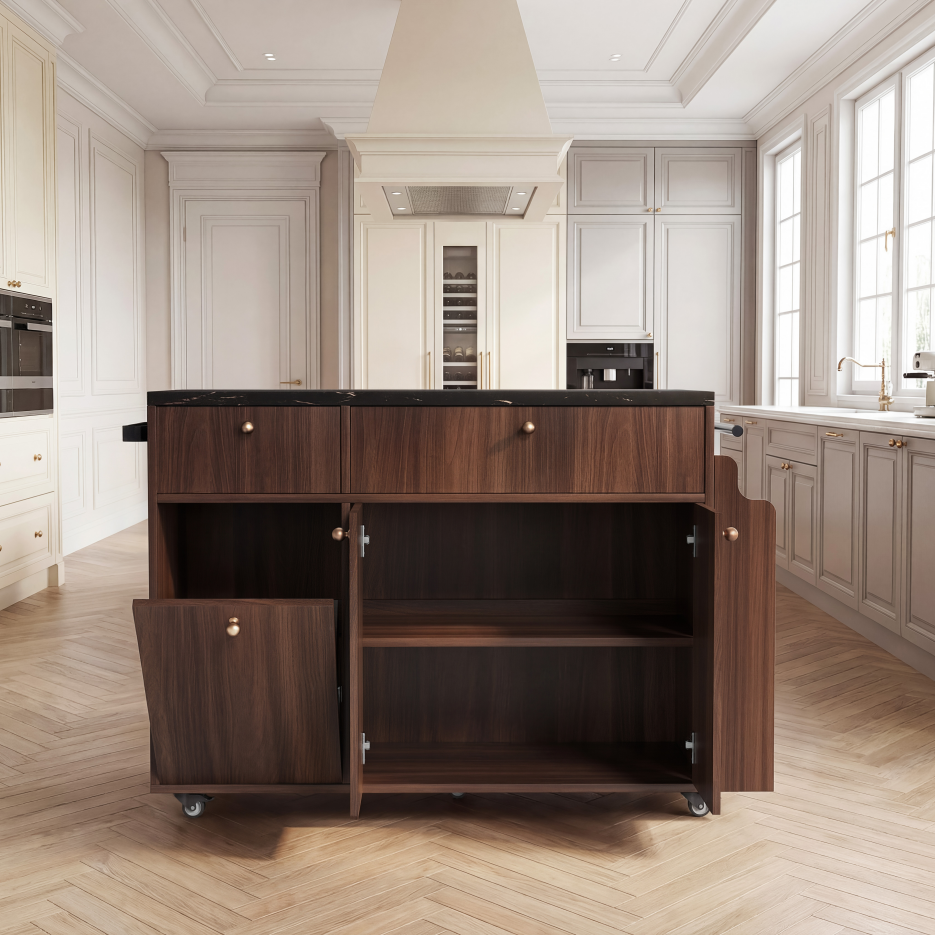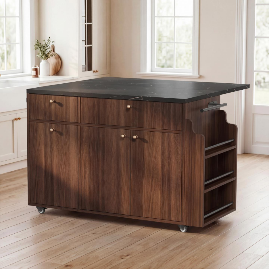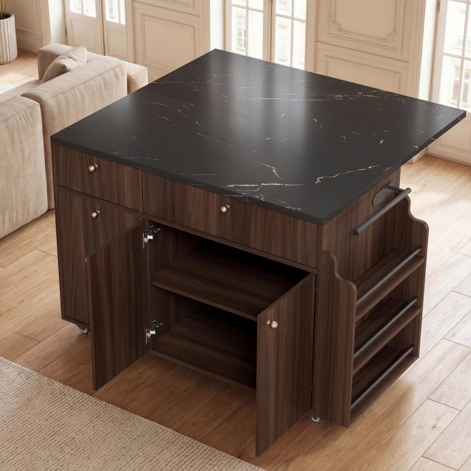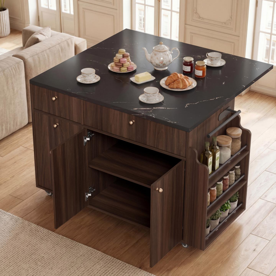 Home > Kitchen Island With Storage Rolling Kitchen Island Cart With Drop Leaf Extension, Black Marble Top, Drawers, Spice Rack, Towel Bar, Mobile Kitche