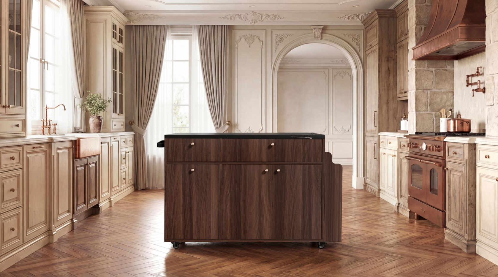 • 2.KITCHEN ISLAND WITH AMPLE STORAGE – Features multiple drawers, open shelves, spice rack, towel bar, and side hooks; organizes utensils, pots, spices, and daily items; keeps counters clear and kitchen tidy.