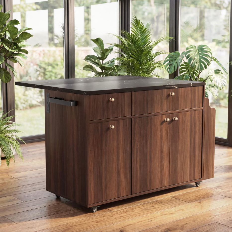 • 1.ROLLING KITCHEN ISLAND CART WITH EXTENDABLE TOP – Smooth-rolling wheels with brakes for easy movement; black marble-look top extends to 31.5 inches wide for additional workspace; ideal for meal prep, baking, or serving in various kitchen layouts.