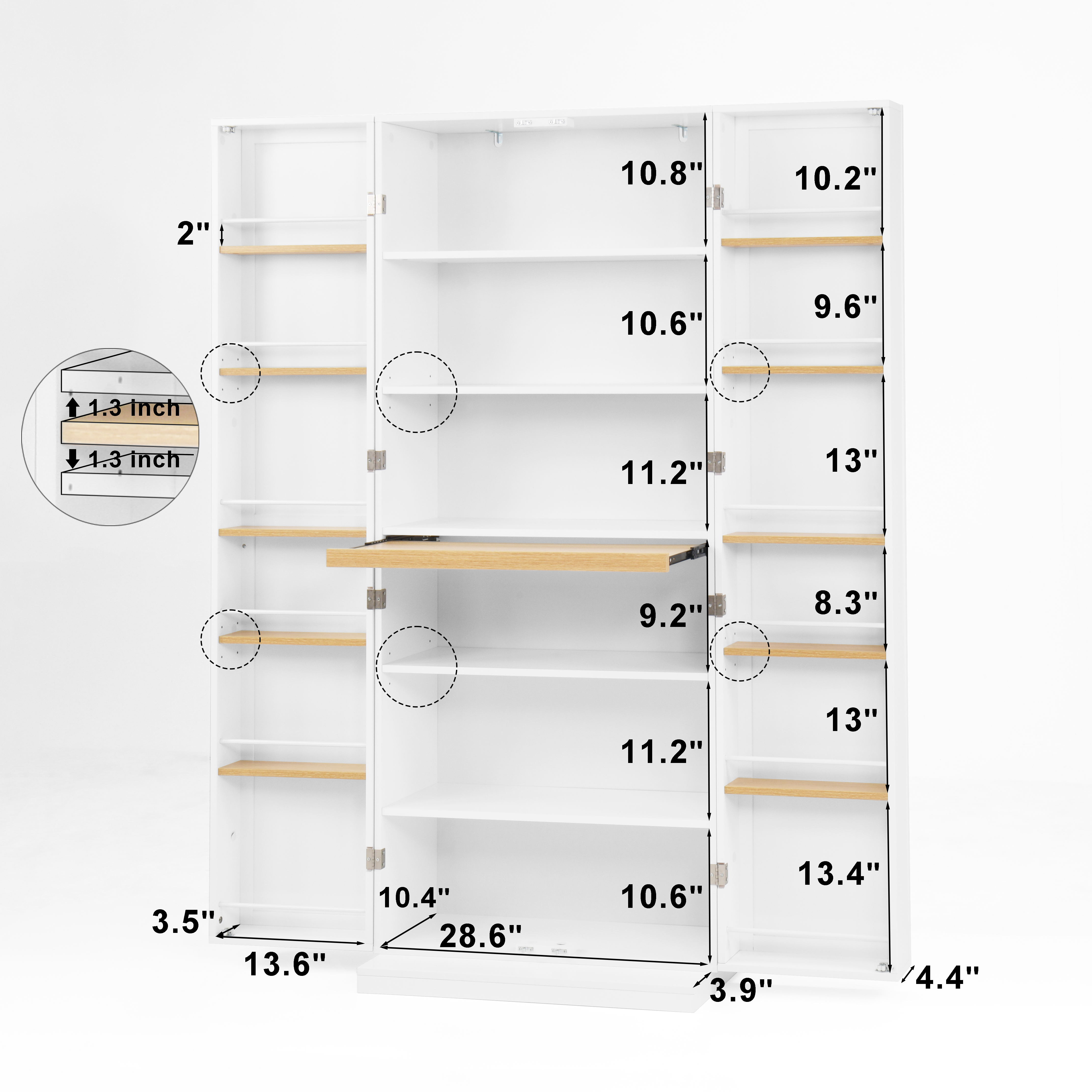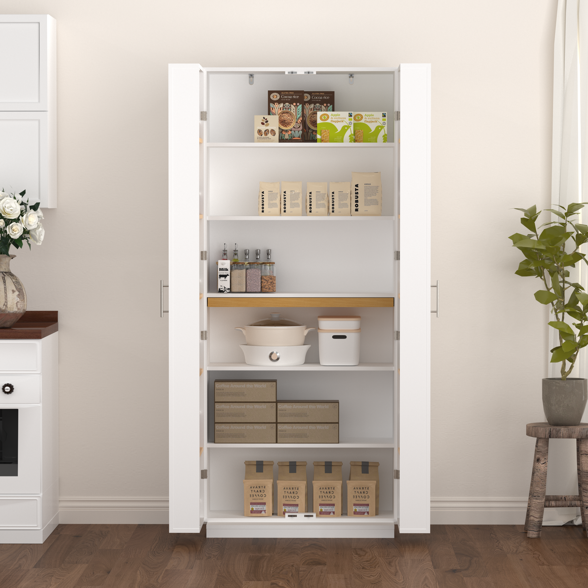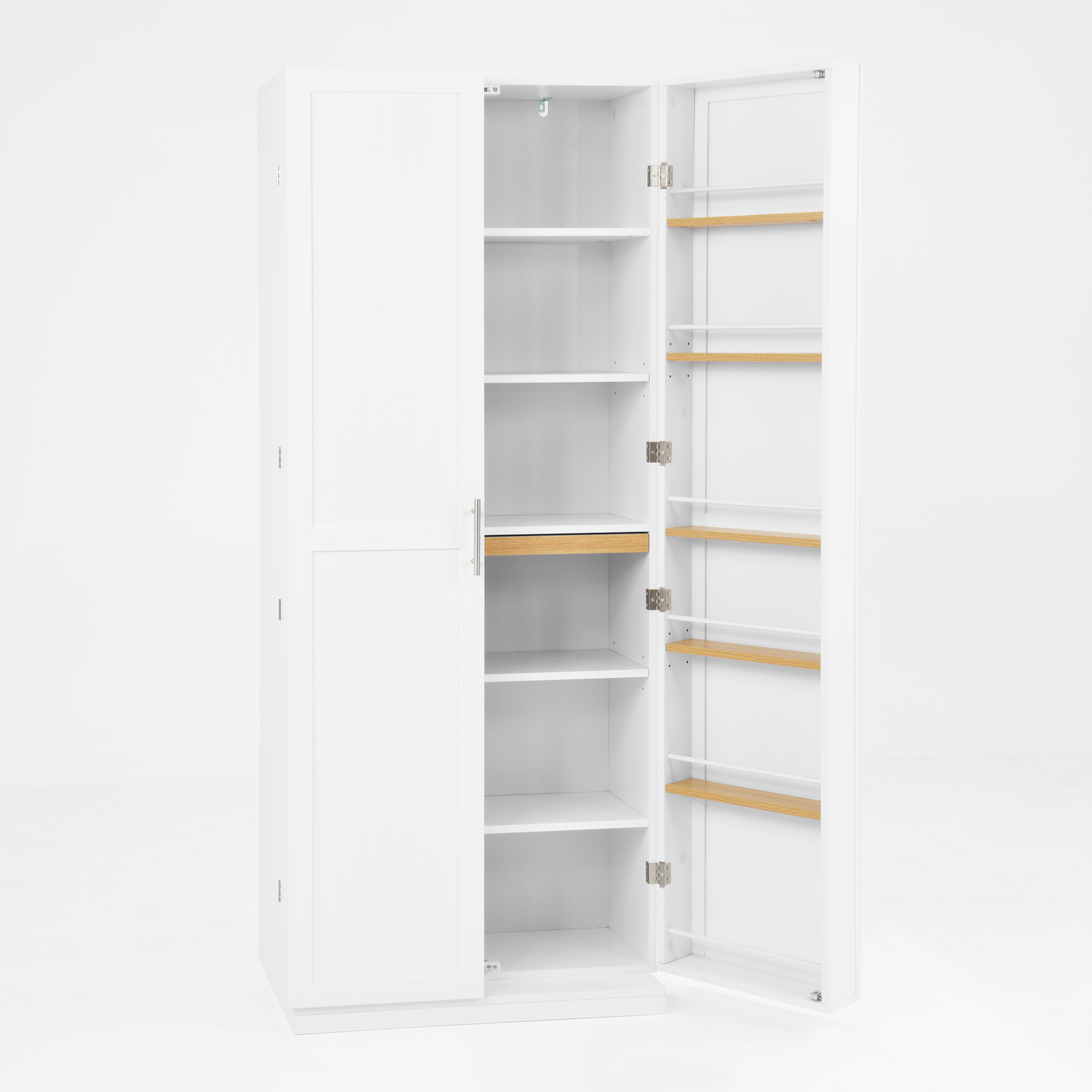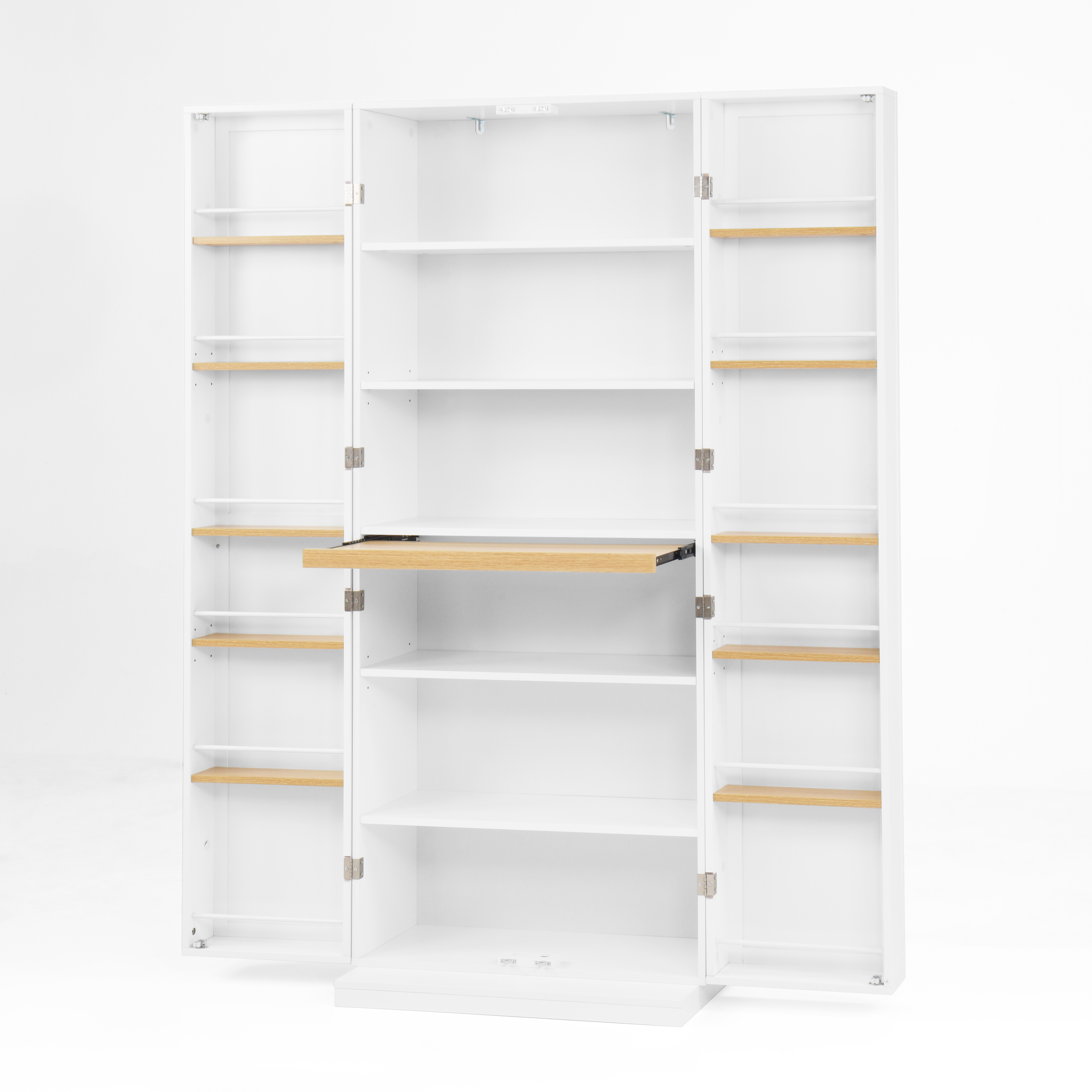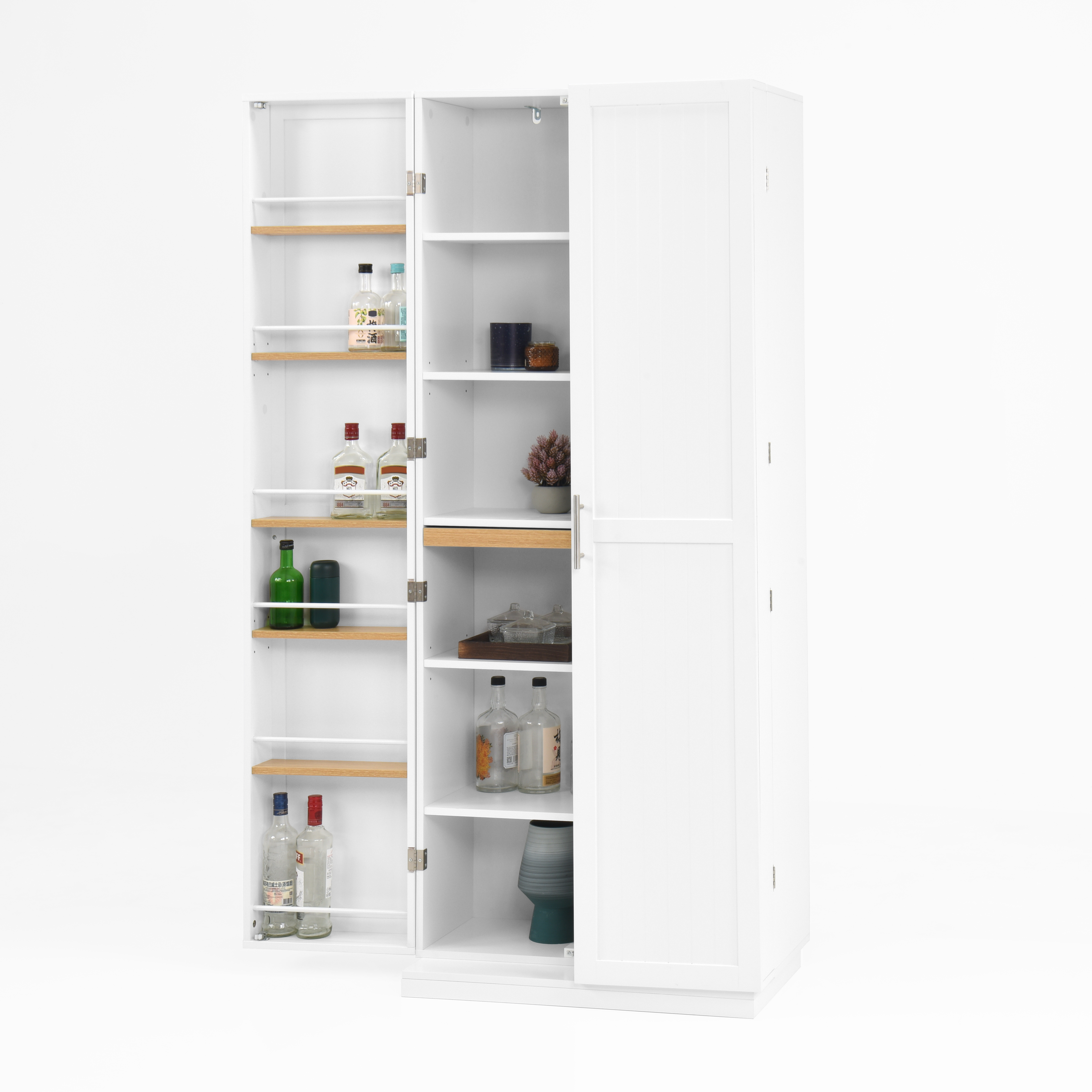 • User-friendly Design: The pantry features 3 height-adjustable shelves that enable users to design a customized space for different-sized kitchen essentials, such as tableware, utensils, spices jars and snacks. There are retractable panels inside the cabinet that can be used to temporarily place items