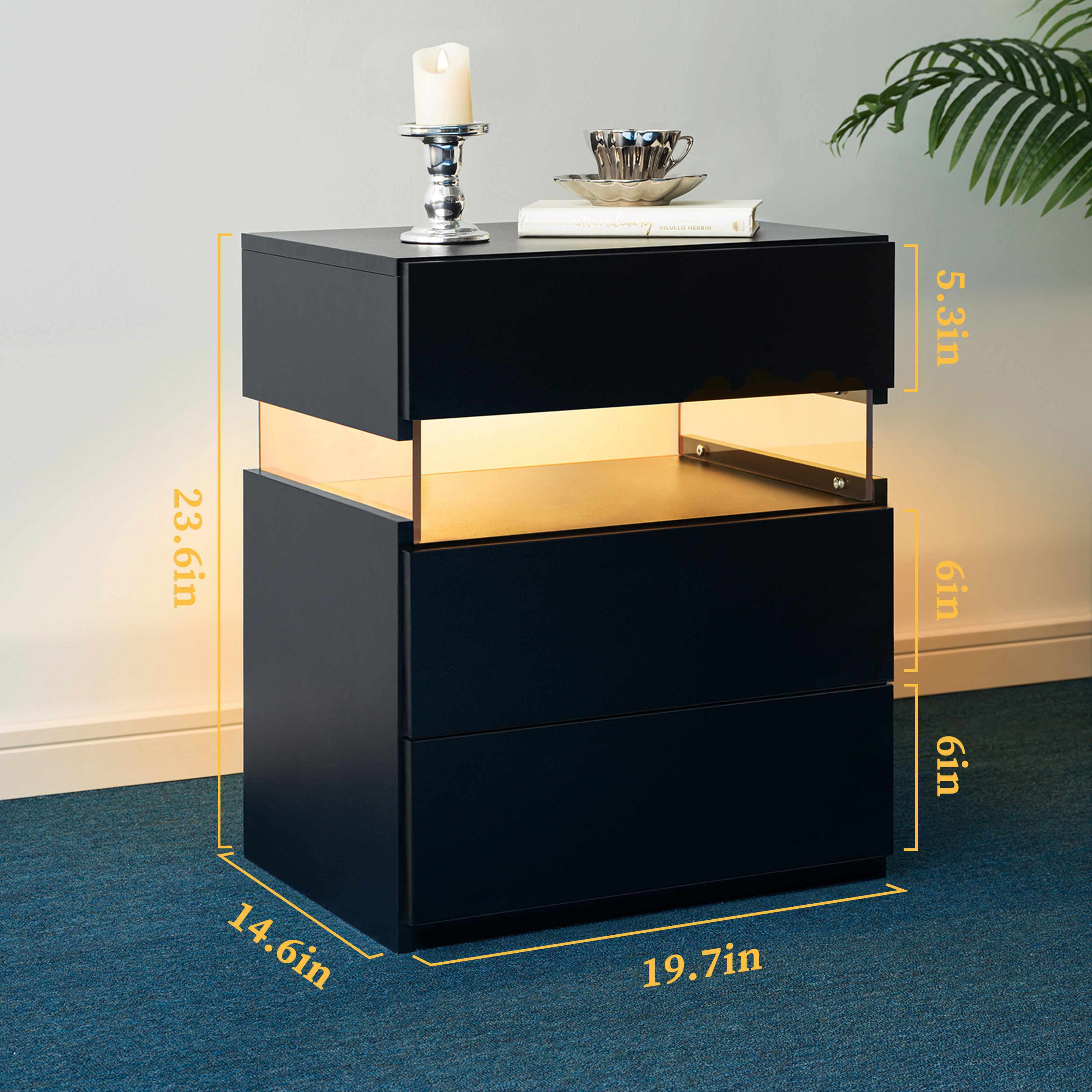 Product Name:LED Nightstands 3 Drawer Dresser for Bedroom End Table with Acrylic Board LED Bedside Tables (Black)