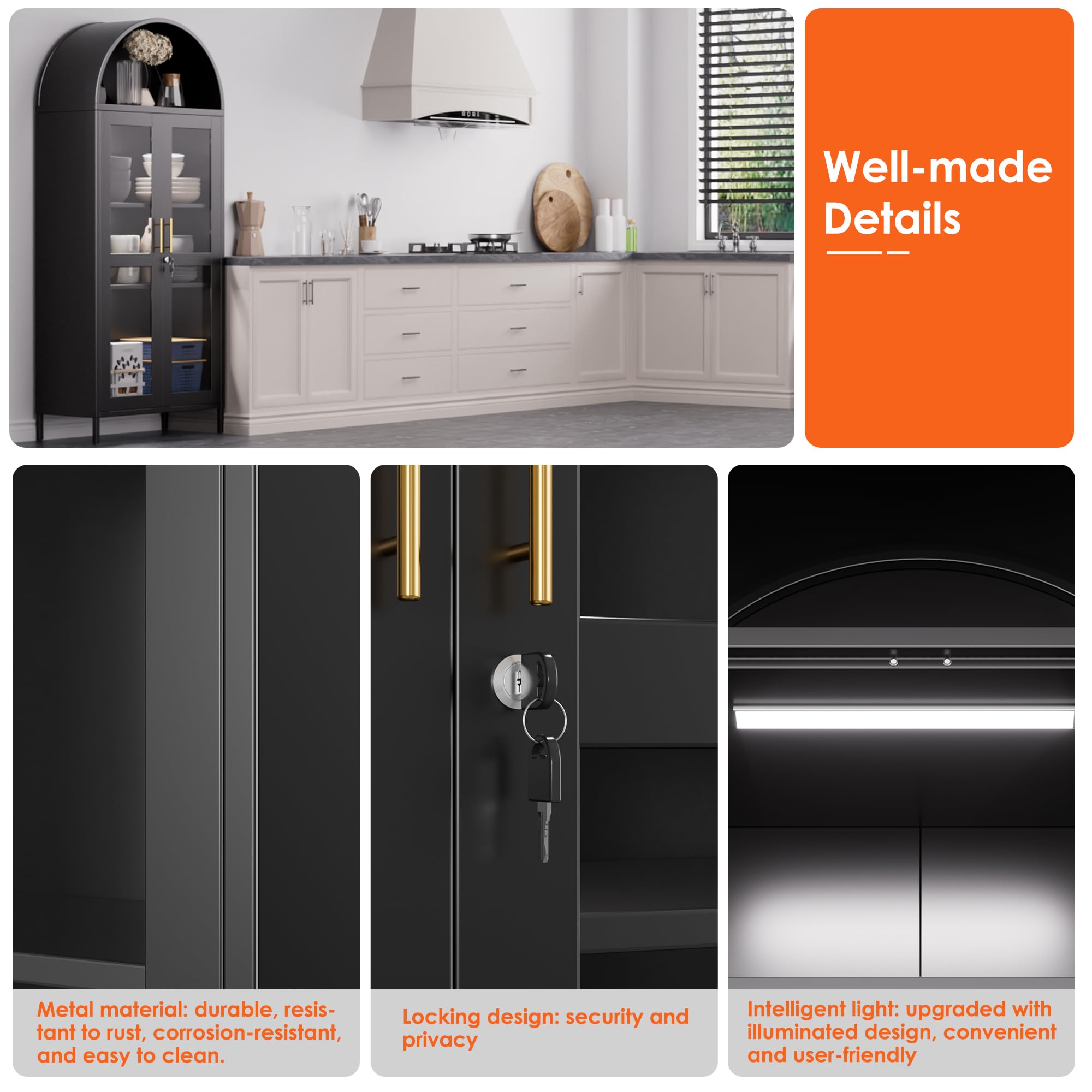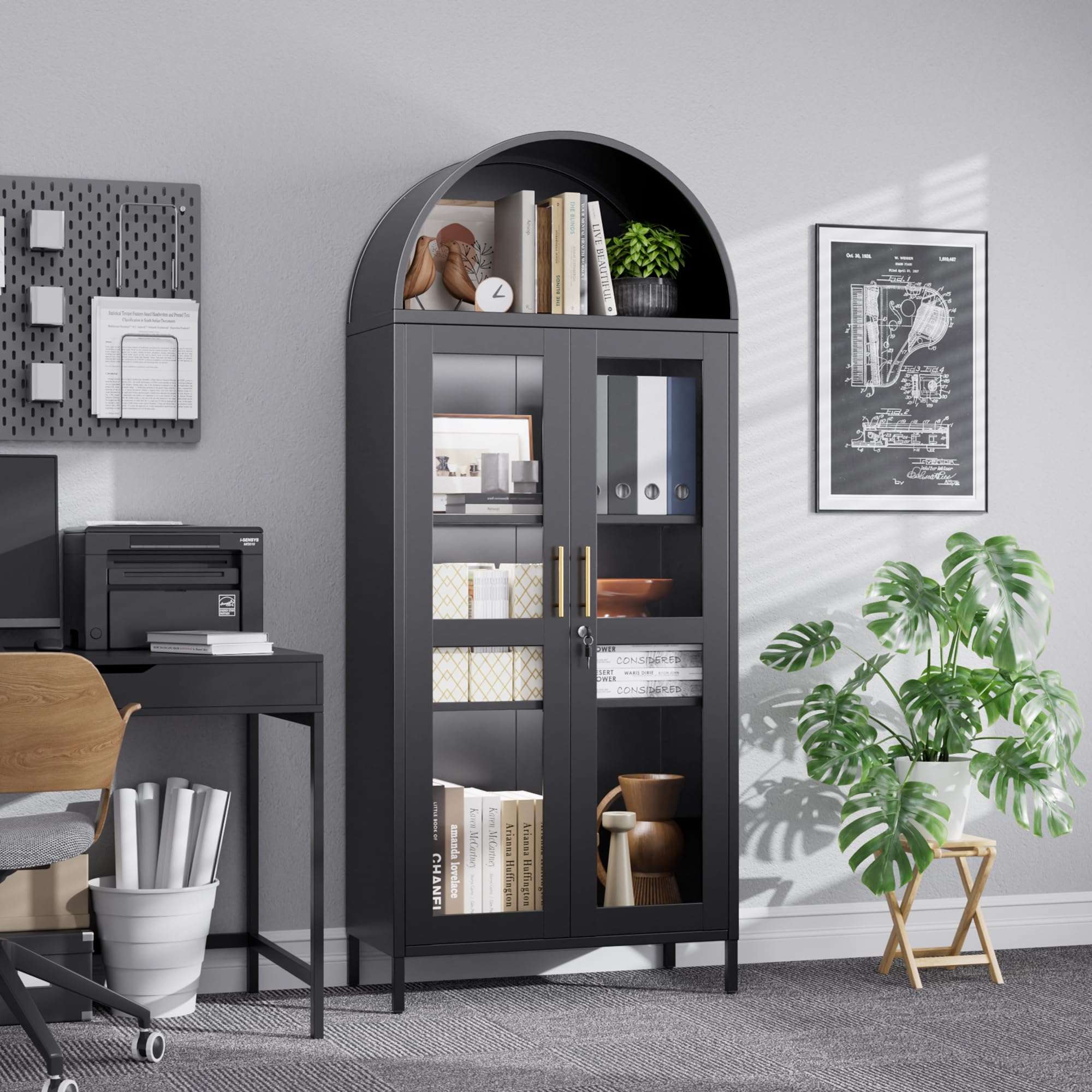 • Good Quality - Metal arched cabinet with glass doors is made of high-quality steel and glass, with no strange odor. The surface of the cabinet is not prone to scratches and the glass is not easily broken. The overall weight of the storage cabinet is light, with good hinges and a sturdy structure, making it sturdy and durable.