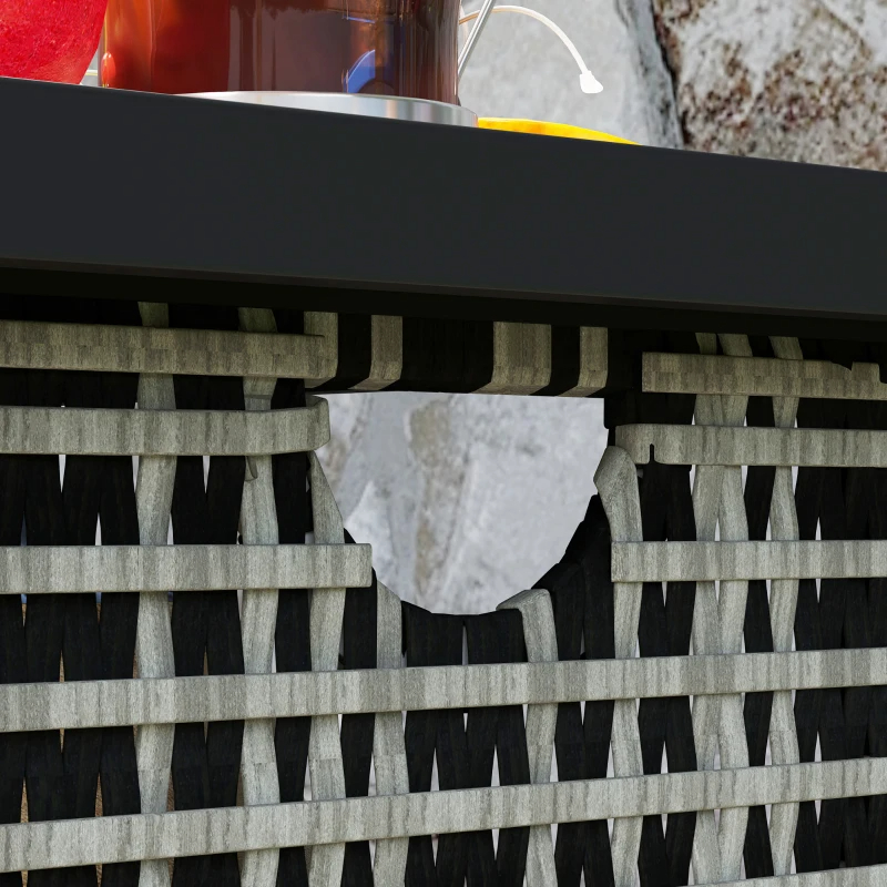 • - Wood grain steel top pairs with rattan body for esthetic versatility