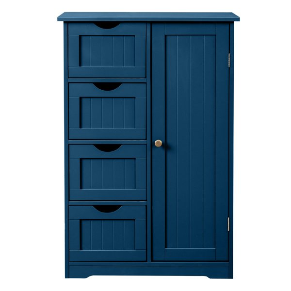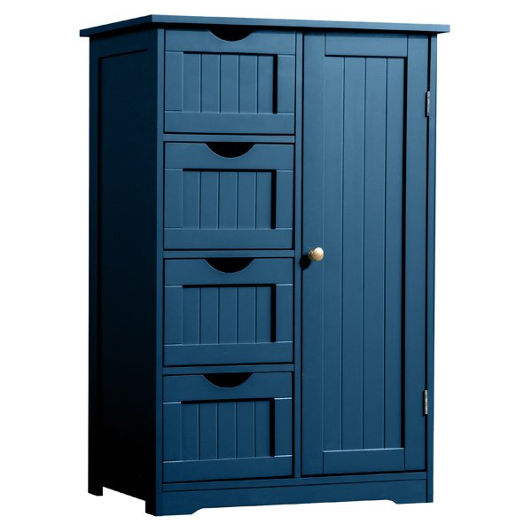 Introducing a sophisticated and functional storage solution with this Navy Blue Bathroom Cabinet, expertly designed to combine style with practicality. Constructed from durable MDF (Medium Density Fiberboard), it features a rich navy blue finish achieved through a combination of paint and a vertical-grain textured melamine laminate, creating a deep color with subtle visual interest. Its space-efficient dimensions of 56cm wide, 30cm deep, and 82.5cm tall make it a perfect fit for modern bathrooms, offering substantial storage without occupying excessive floor space. The cabinet's smart layout includes four smooth-running drawers for organized small-item storage and a single upper door concealing additional shelving, providing a versatile home for all your toiletries and essentials. Easy to assemble and built for durability, it arrives in secure packaging (90*35.5*17cm, 16.05kg) and boasts a stable, solid construction with an assembled weight of 14.65kg.