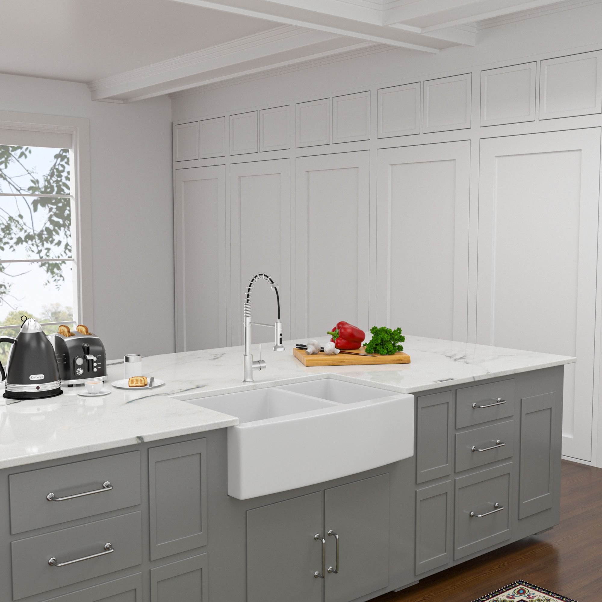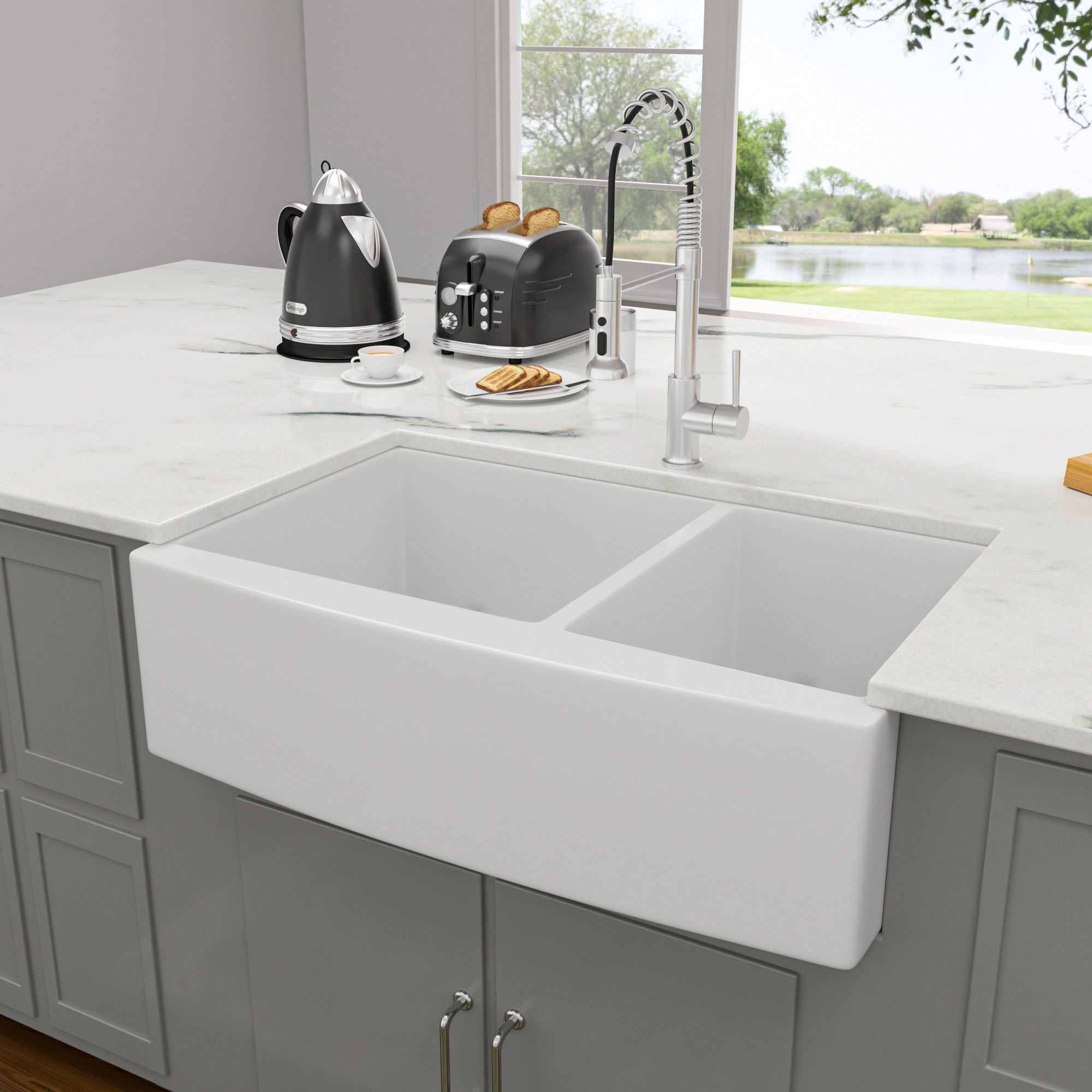 1.Our 33inch Farmhouse Dual Bowl Ceramic Sink has classical Apron Front design which makes it the perfect addition to your kitchen, white color adds an elegant touch.