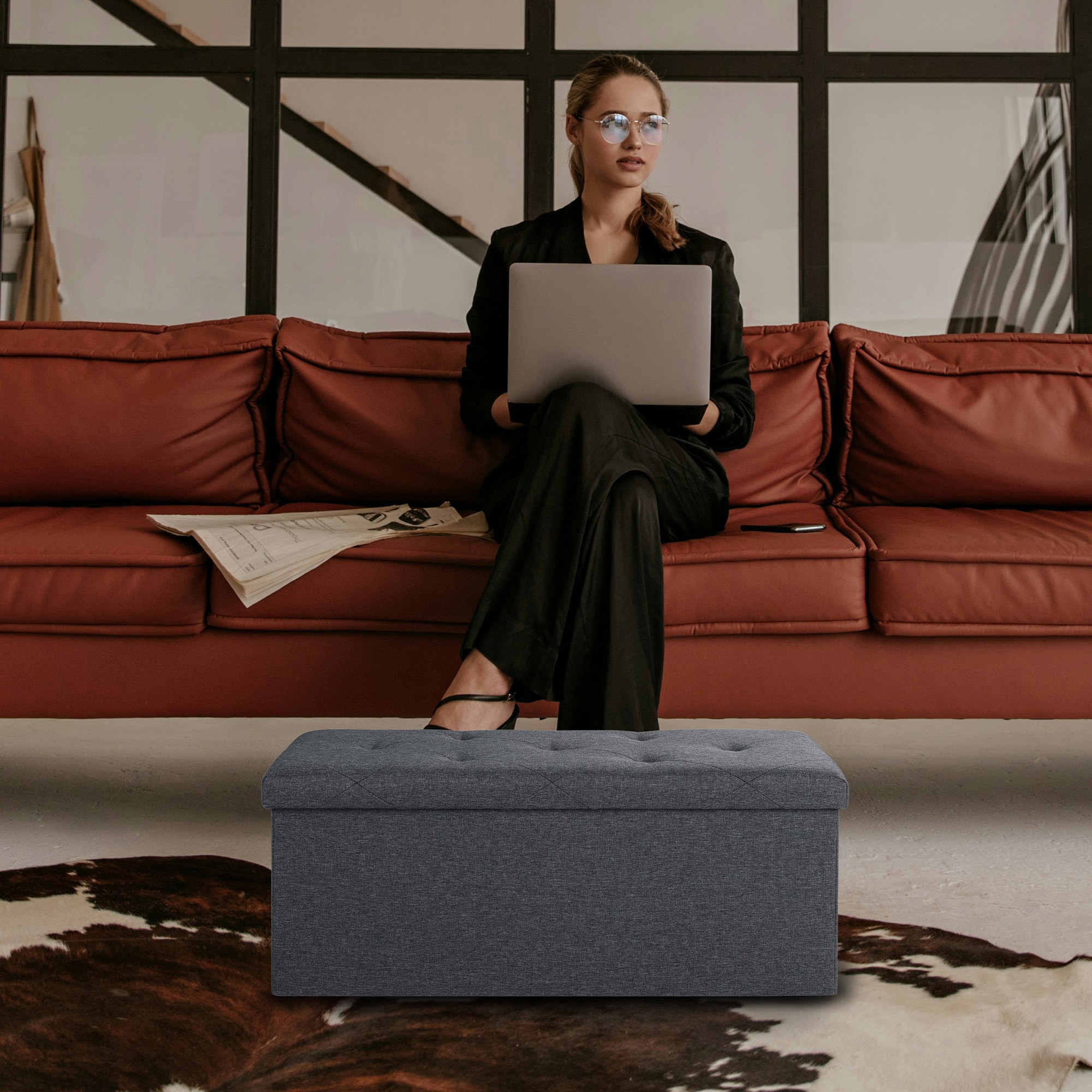 Product Name: Folding Storage Ottoman Bench, Ottoman Foot Rest, End of Bed Bench, Storage Chest, for Living Room, Bedroom, Entryway, 30 Inches, Gray