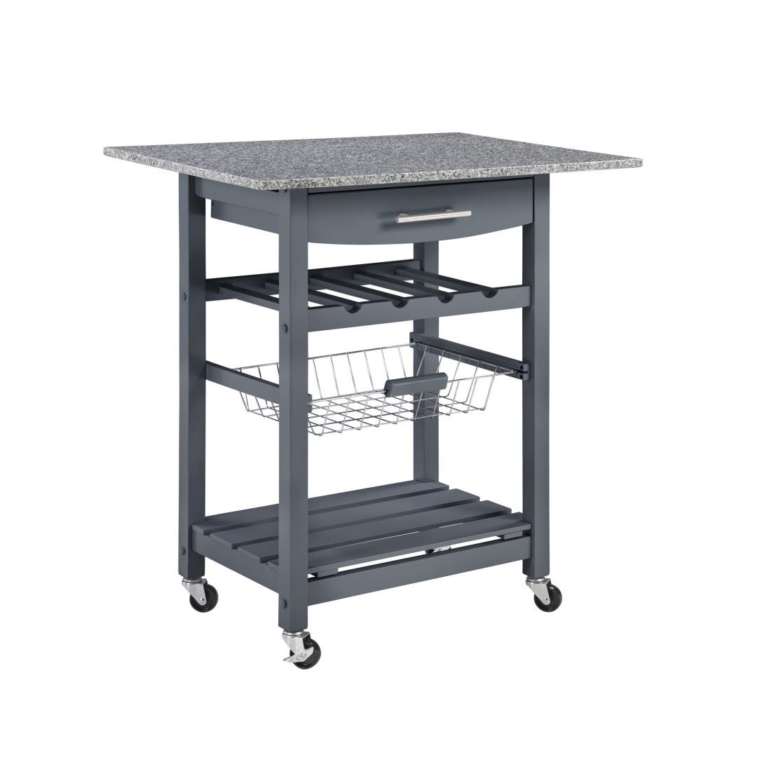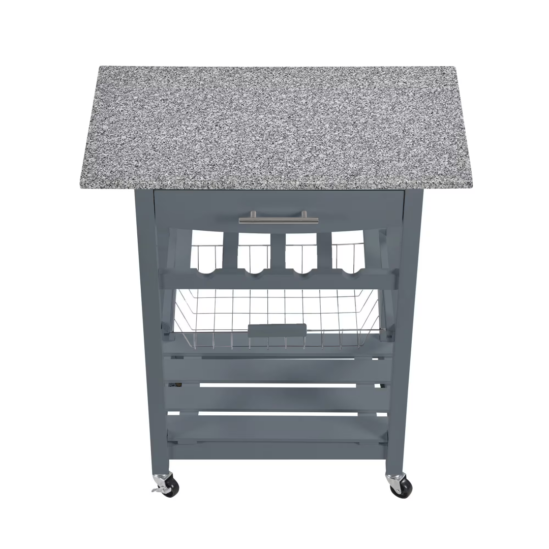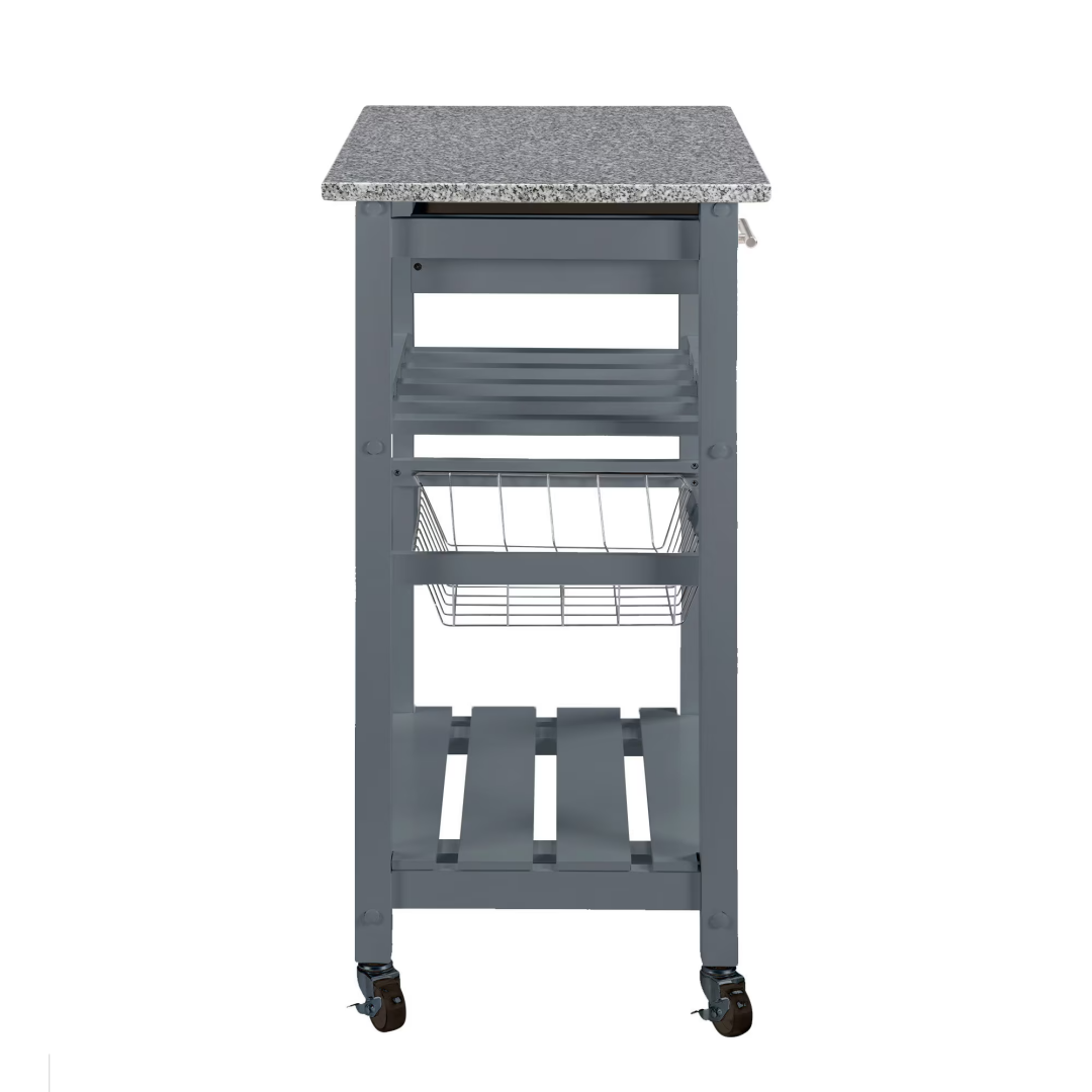ã€Versatile Storage Solutions】: Featuring a single MDF board drawer with a metal handle and a stainless steel basket, this island provides practical storage options for kitchen essentials.