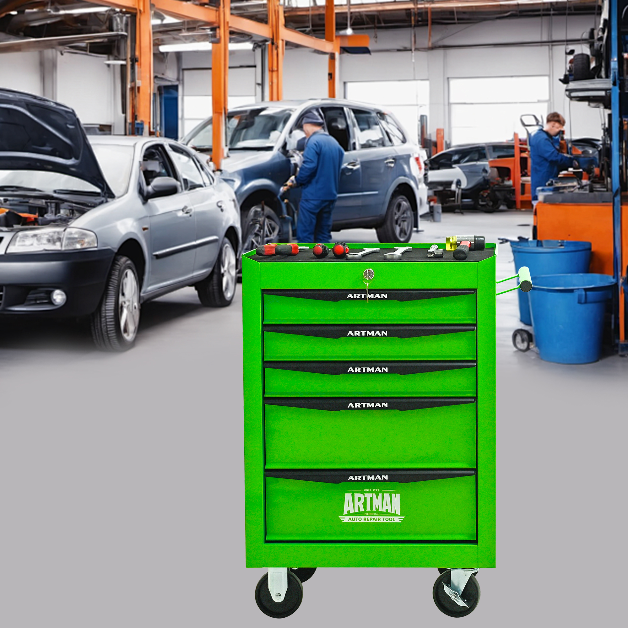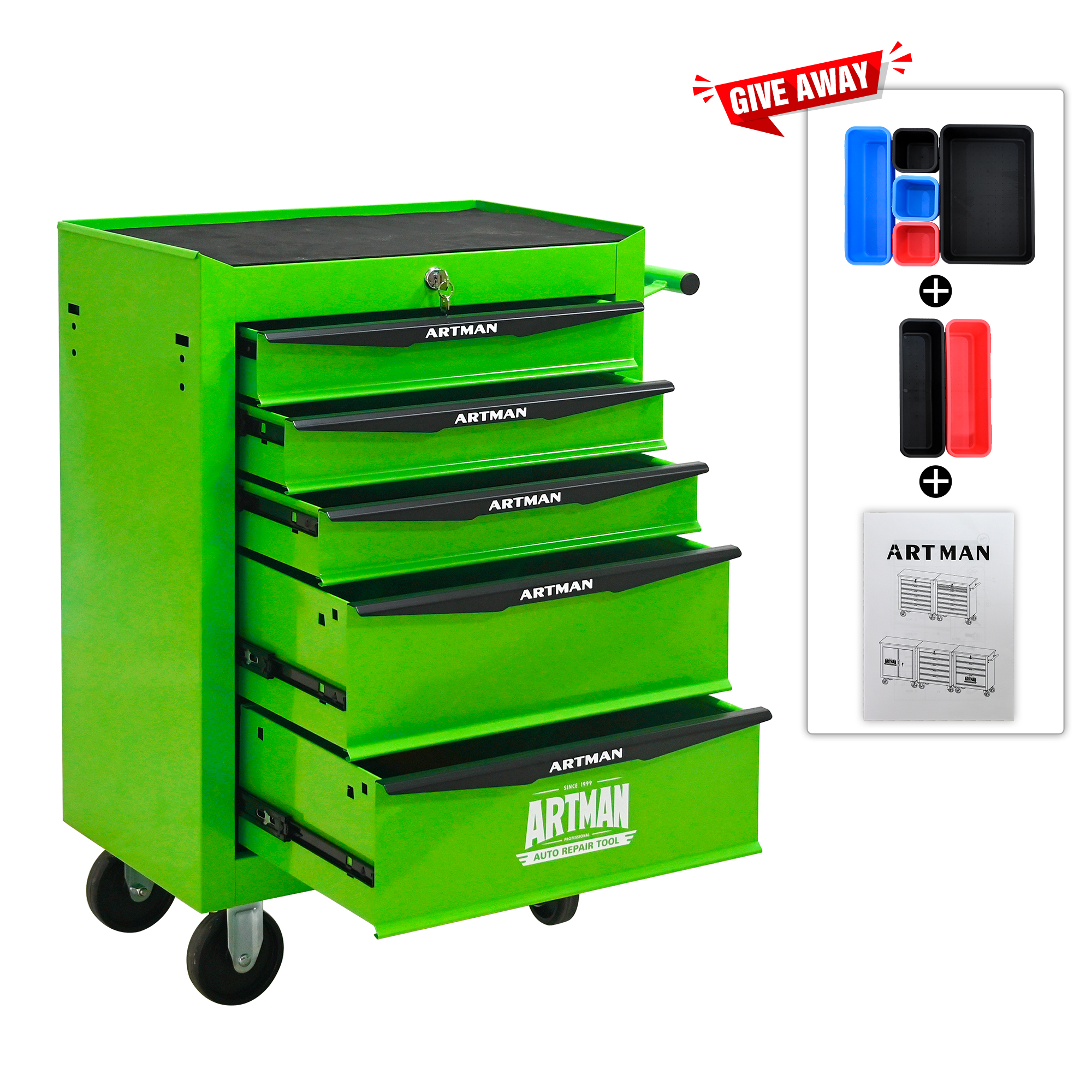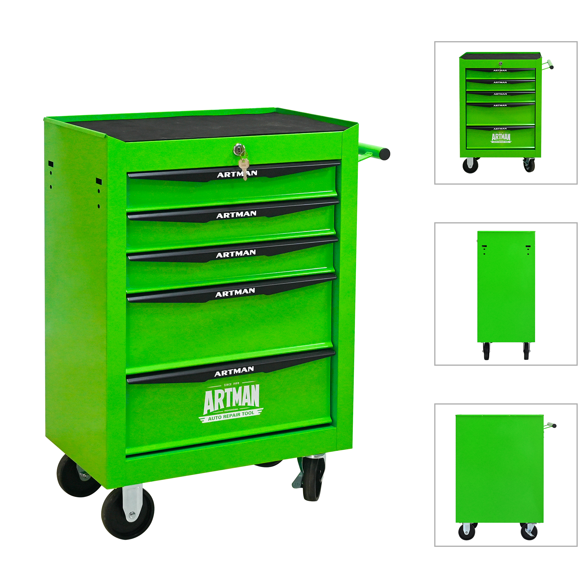 • 5 Drawers mutifunctional tool cart with wheels. This assembly trolley has 4 steering wheels, 2 of which with parking brakes, so you can move the trolley freely in the garage, but also stop in one place.