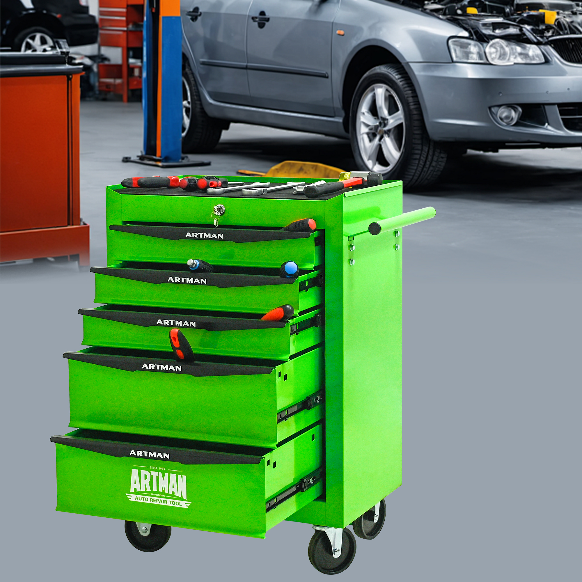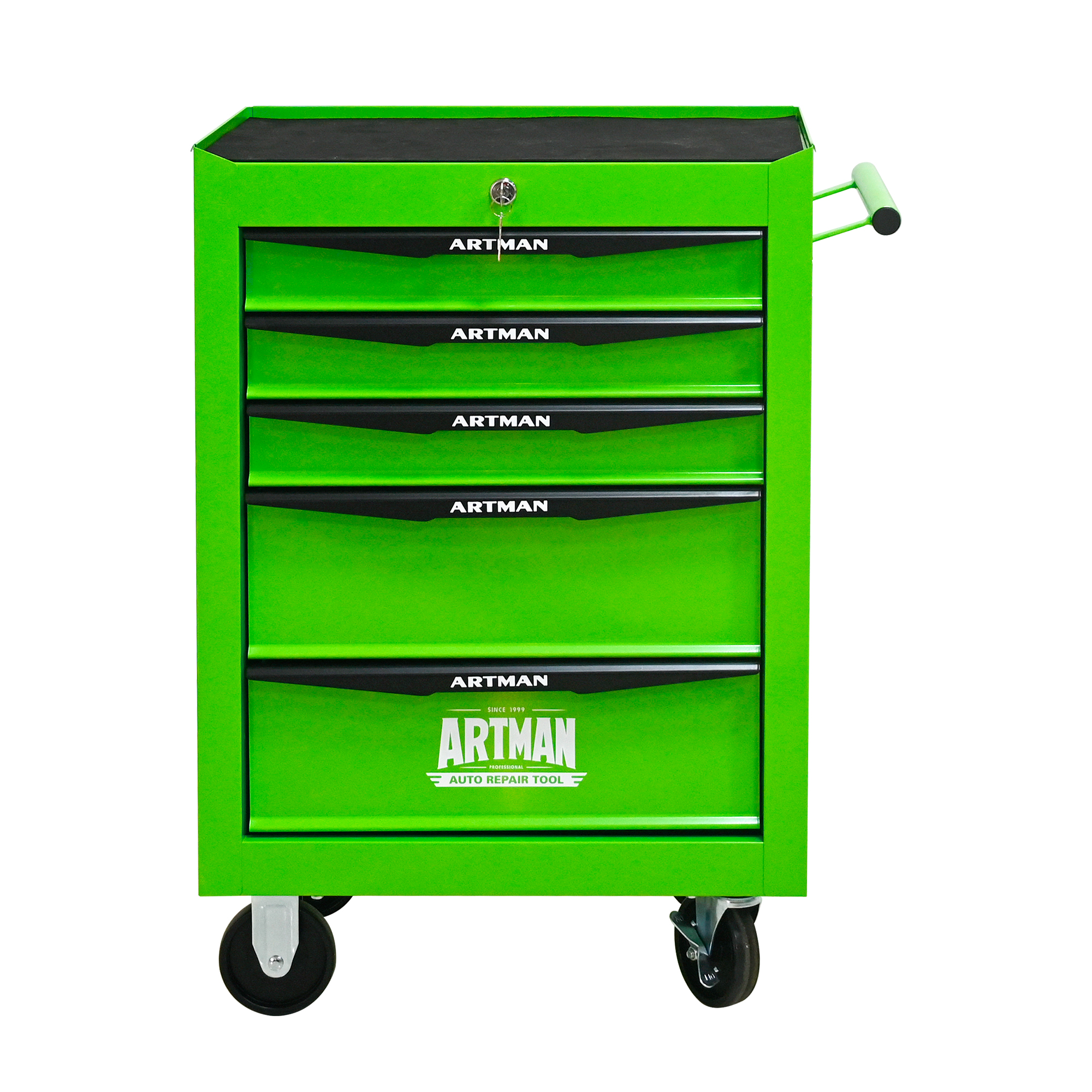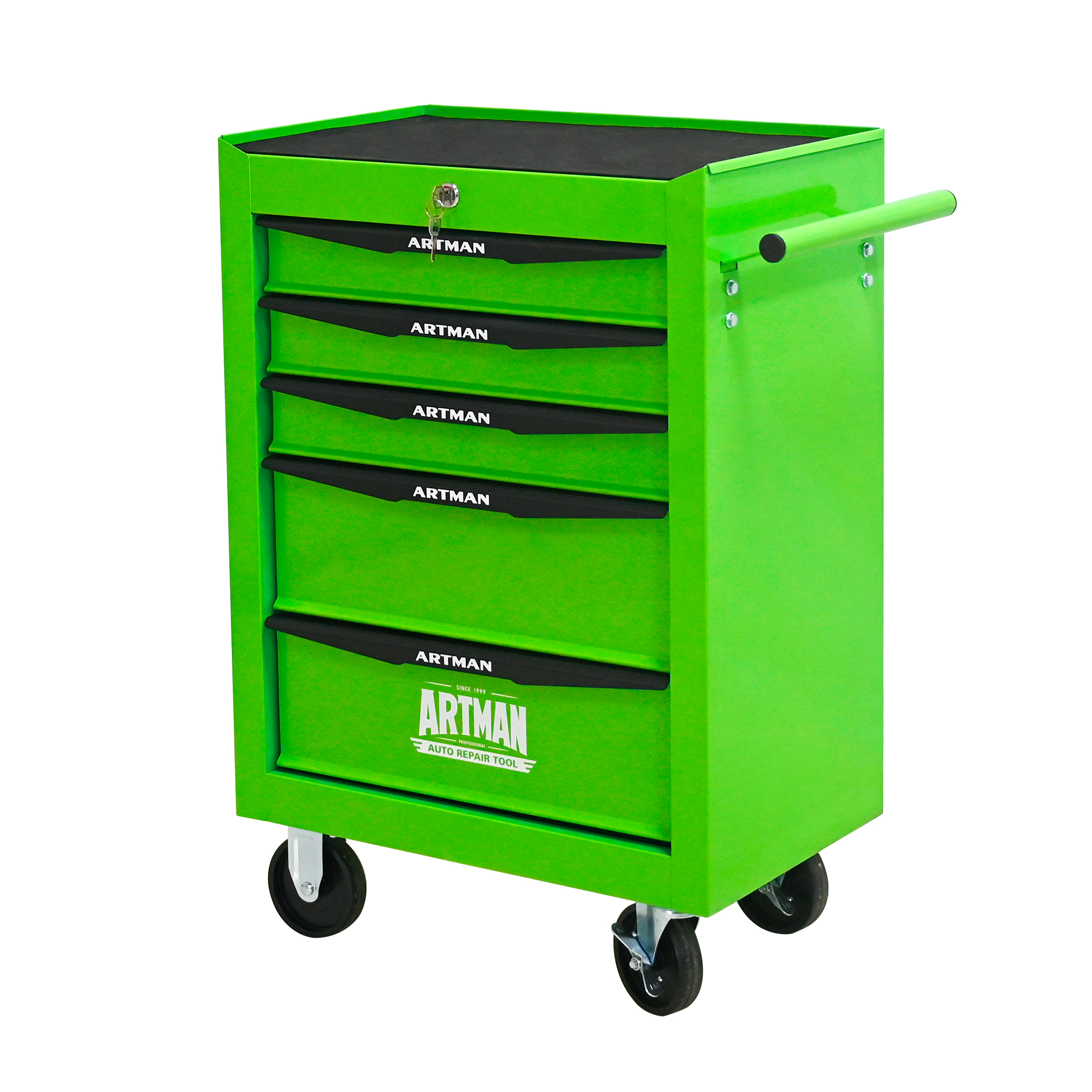 • 5 Drawers mutifunctional tool cart with wheels. This assembly trolley has 4 steering wheels, 2 of which with parking brakes, so you can move the trolley freely in the garage, but also stop in one place.