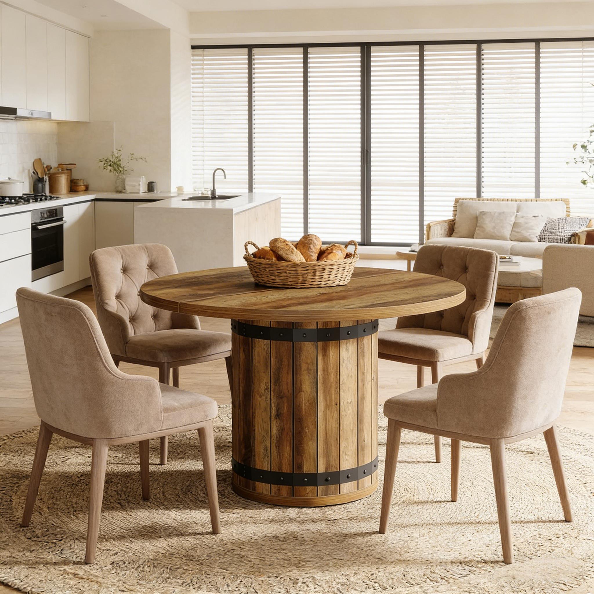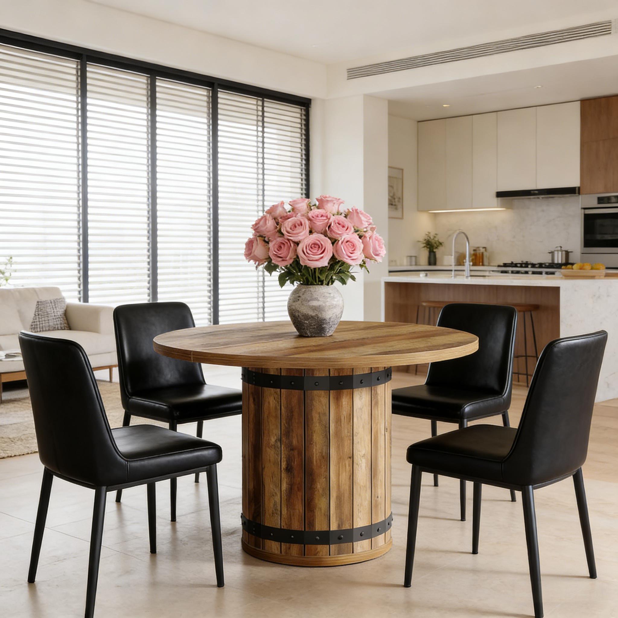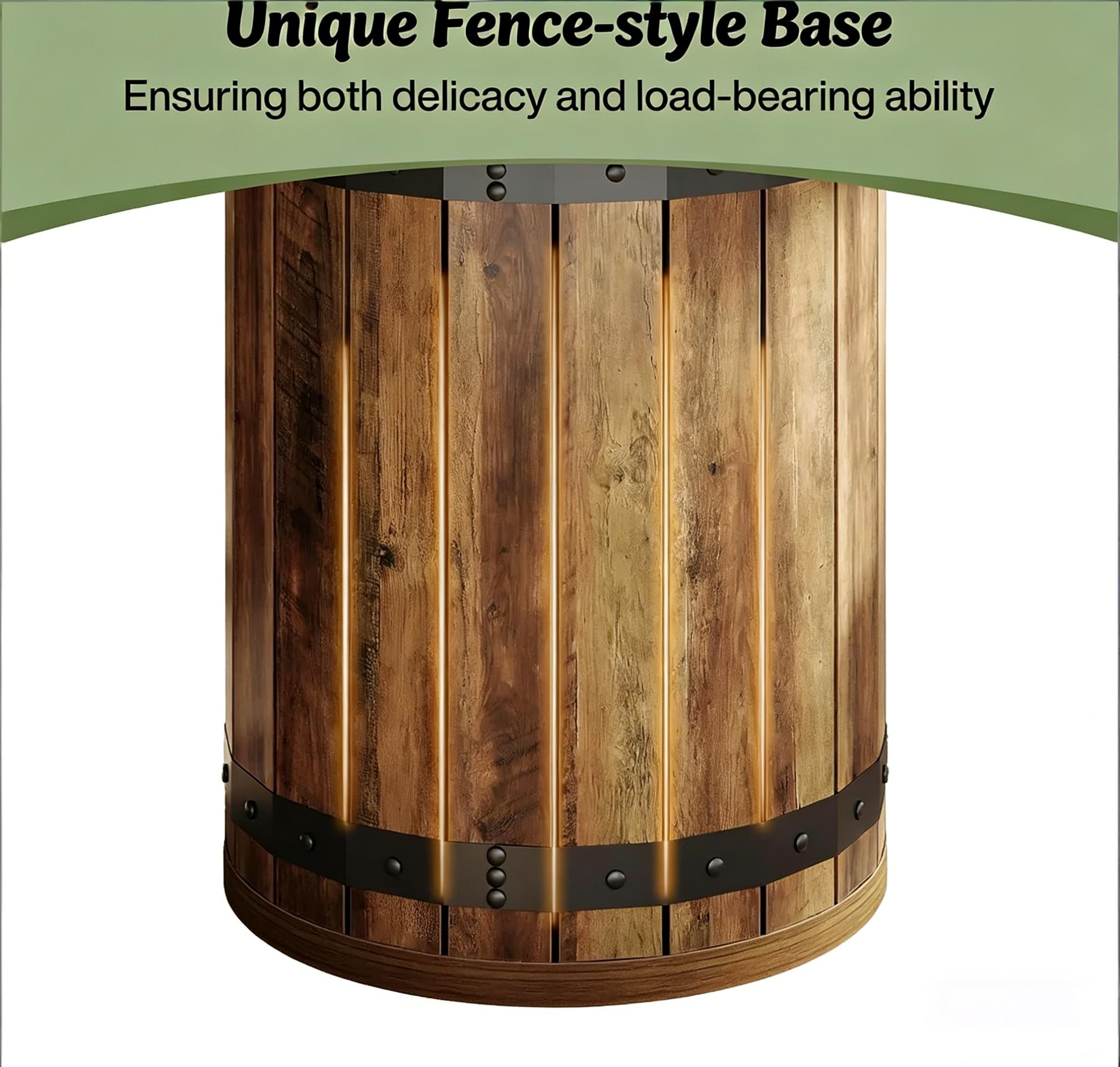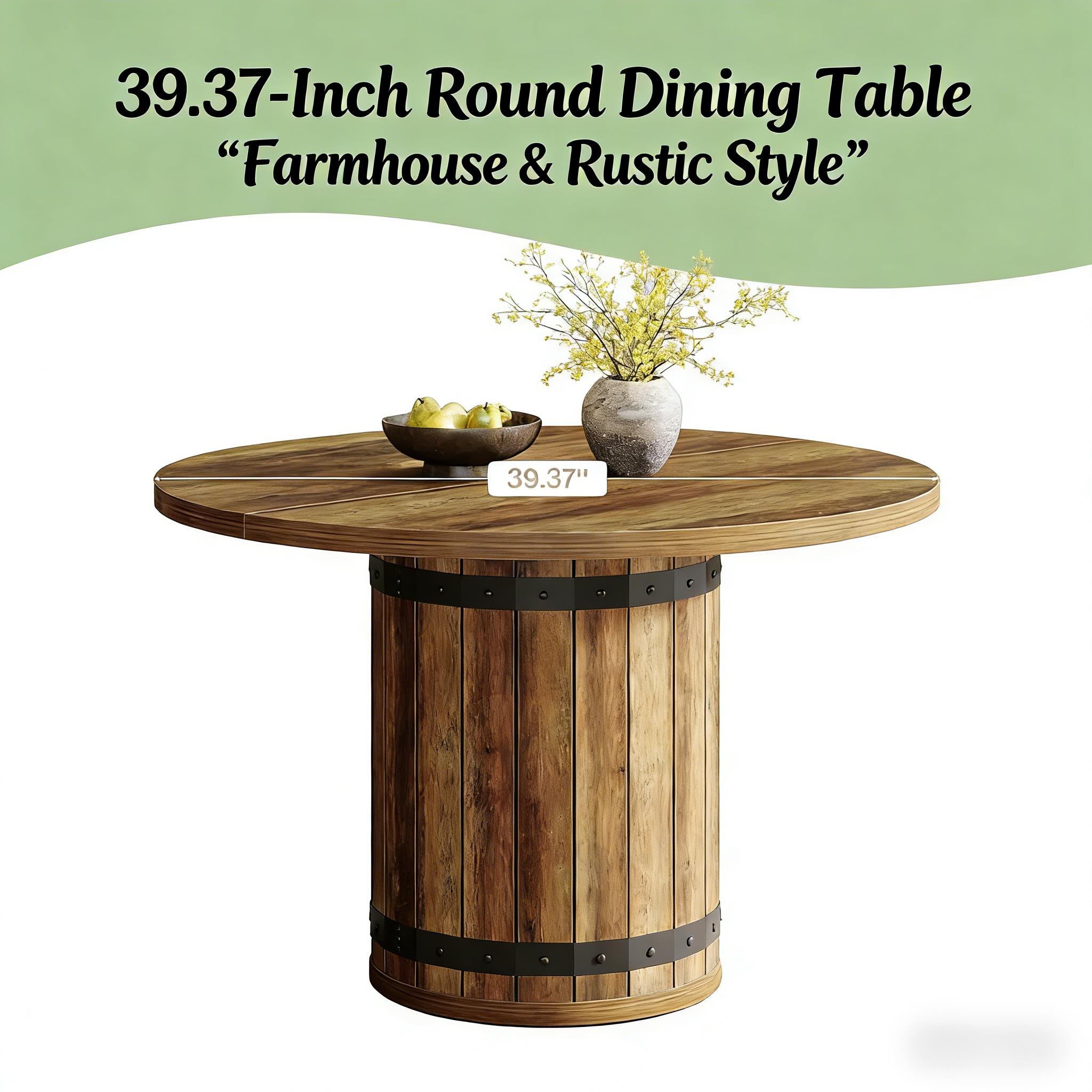 • Important Reminder!!! 1) Attention: All products in our store do not support Canada self pickup ordering. Please do not create shipping labels for Canada. Our American products do not support self pickup to Canada 2)We do not ship to Alaska, Hawaii, US protectorates (e.g., Puerto Rico), P.O. boxes, or APO/FPO addresse 3)We don’t accept non-defective remorse returns Classic Farmhouse Aesthetic - This 39.37-inch round dining table features a rustic brown finish and charming fence pedestal base, exuding a welcoming farmhouse elegance that can enhance any dining space. Durable and Stable Dining Table - Crafted from premium MDF, this farmhouse dining table is designed for longevity. Its heavy-duty base ensures stability, providing a sturdy foundation that eliminates wobbling during meals. Conversation-Enhancing Round Design - With dimensions of 39.37" D x 39.37" W x 29.52" H, this round dining table comfortably accommodates up to 4 people. The round shape fosters communication and interaction, making it the ideal centerpiece for your dining room or kitchen. Ideal for Dining and Socializing - This 39.37-inch round dining table serves as the perfect focal point for family meals and social gatherings. Its spacious design enables loved ones to sit closely together, creating a cozy atmosphere ideal for sharing meals and stories. Effortless Assembly - With all the necessary hardware included and a detailed instruction manual, assembling this 39.37-inch round dining table becomes a straightforward and enjoyable task. Should you encounter any issues, please don't hesitate to reach out to us.