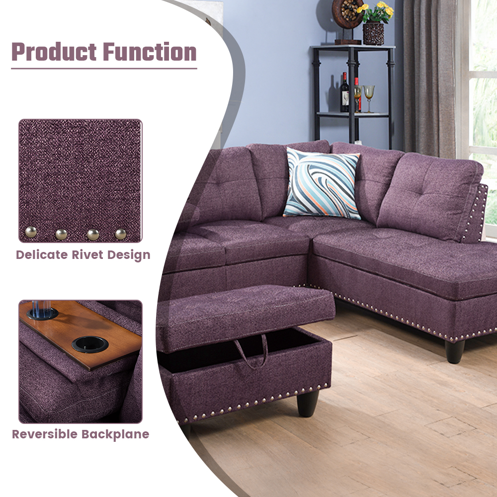 CHARACTERISTIC a. The sofa (Purple) with decorative copper nails, made of nickel plating, with stronge sense of elegance.