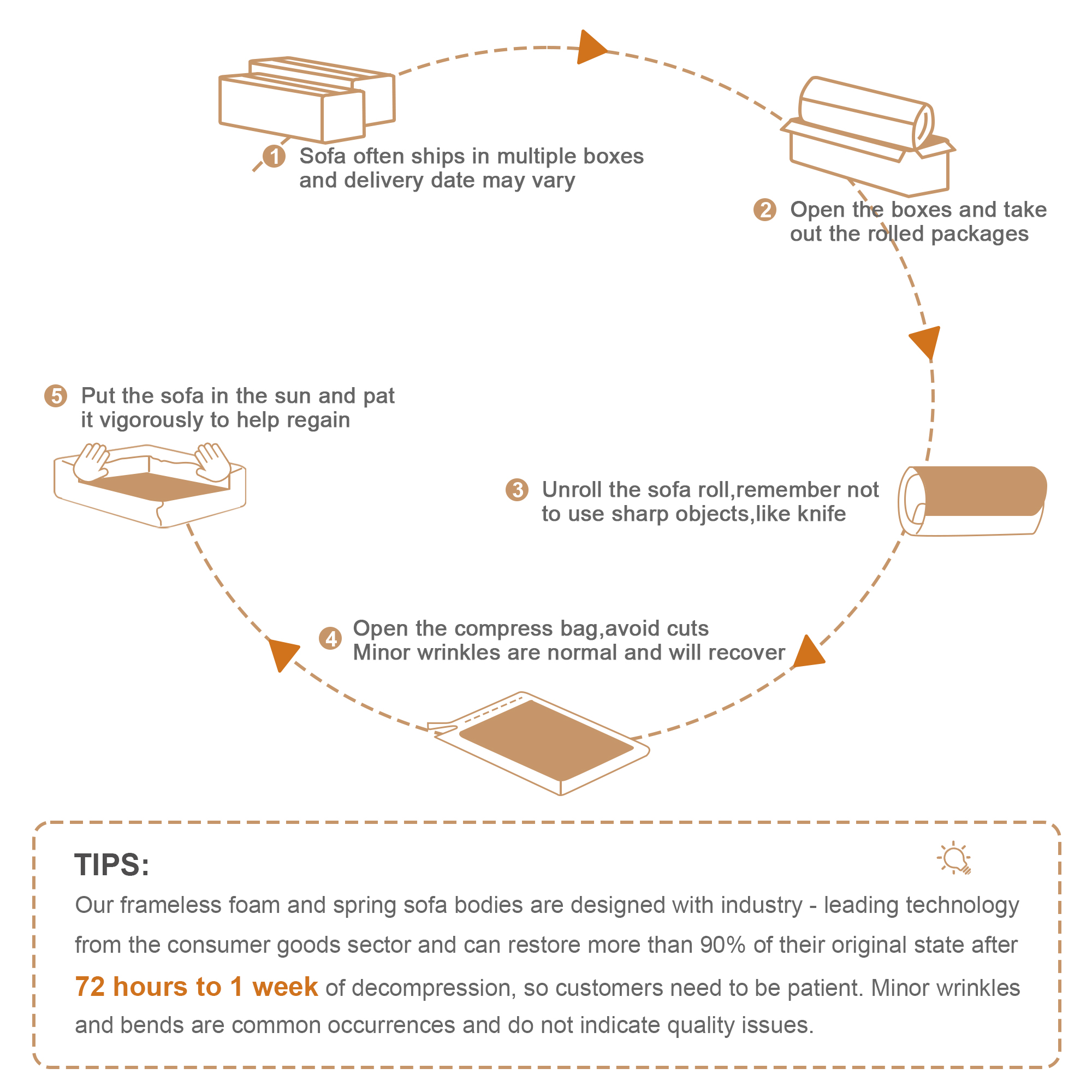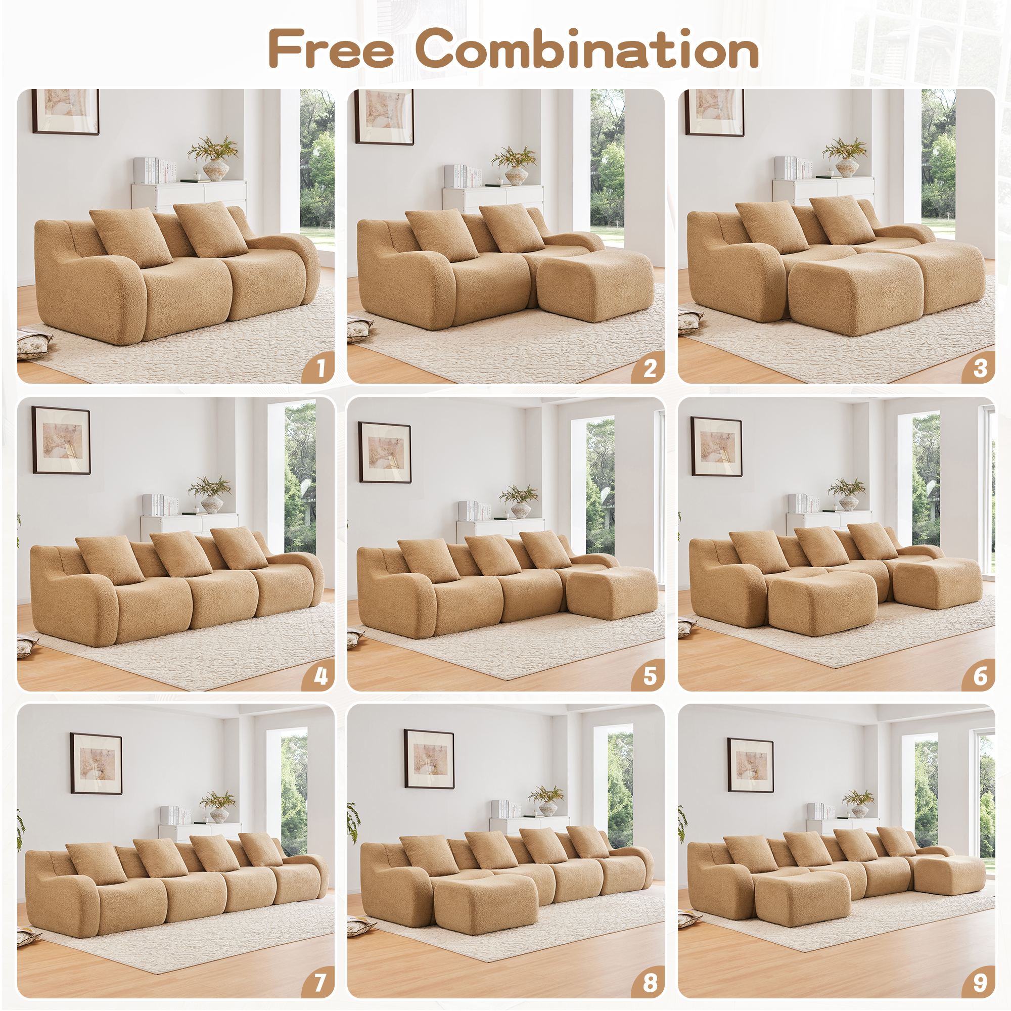 • No Assembly Required: Our modular sofa eliminates the hassle of complicated furniture setup – it's ready to arrange right out of the box. Simply unpack all components and gently pat each module to activate its elasticity, restoring its beautiful shape.