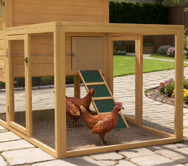 • - Large Outdoor Run: The chicken house attaches to a wide-open fenced enclosure, allowing plenty of room to move around and making your animals happy.