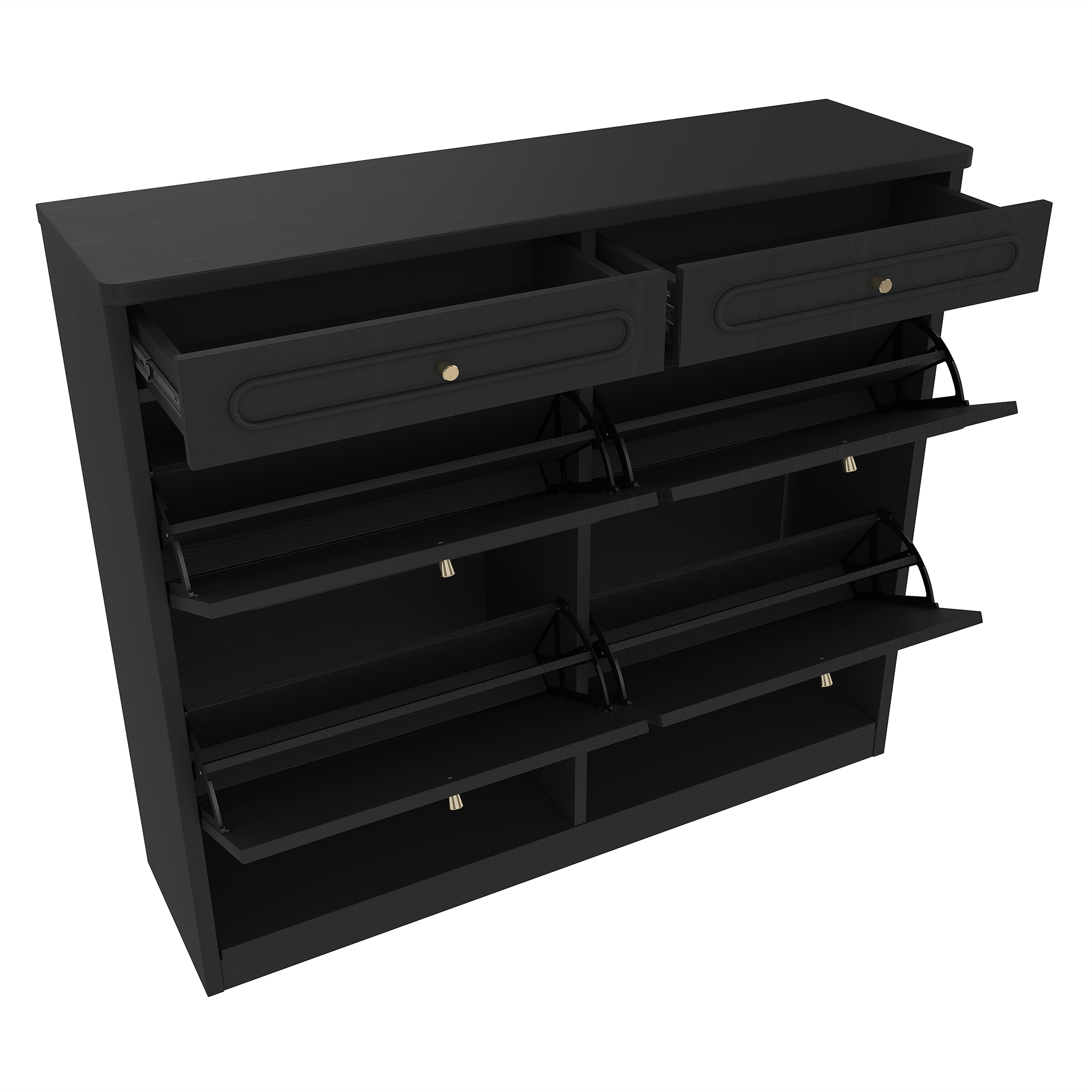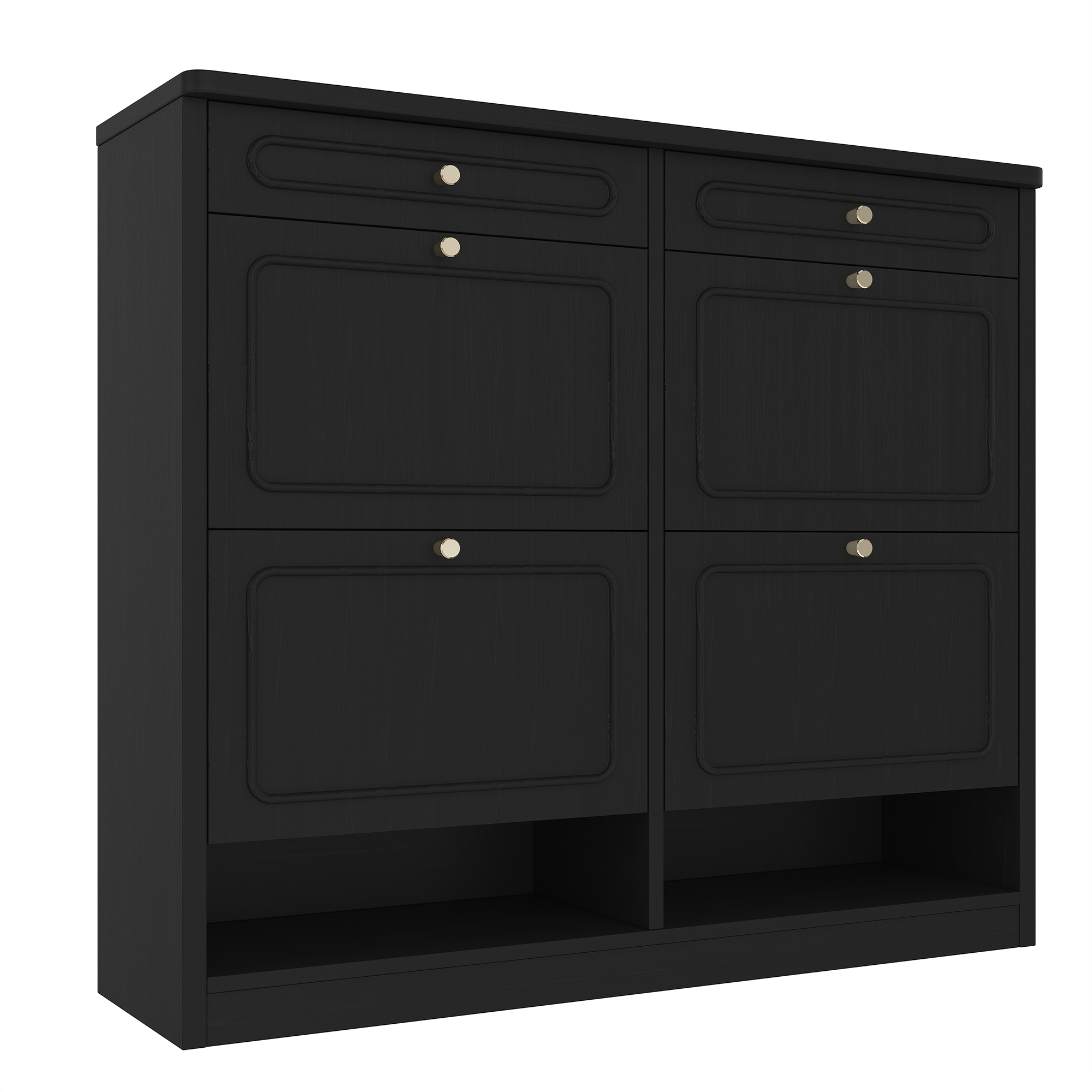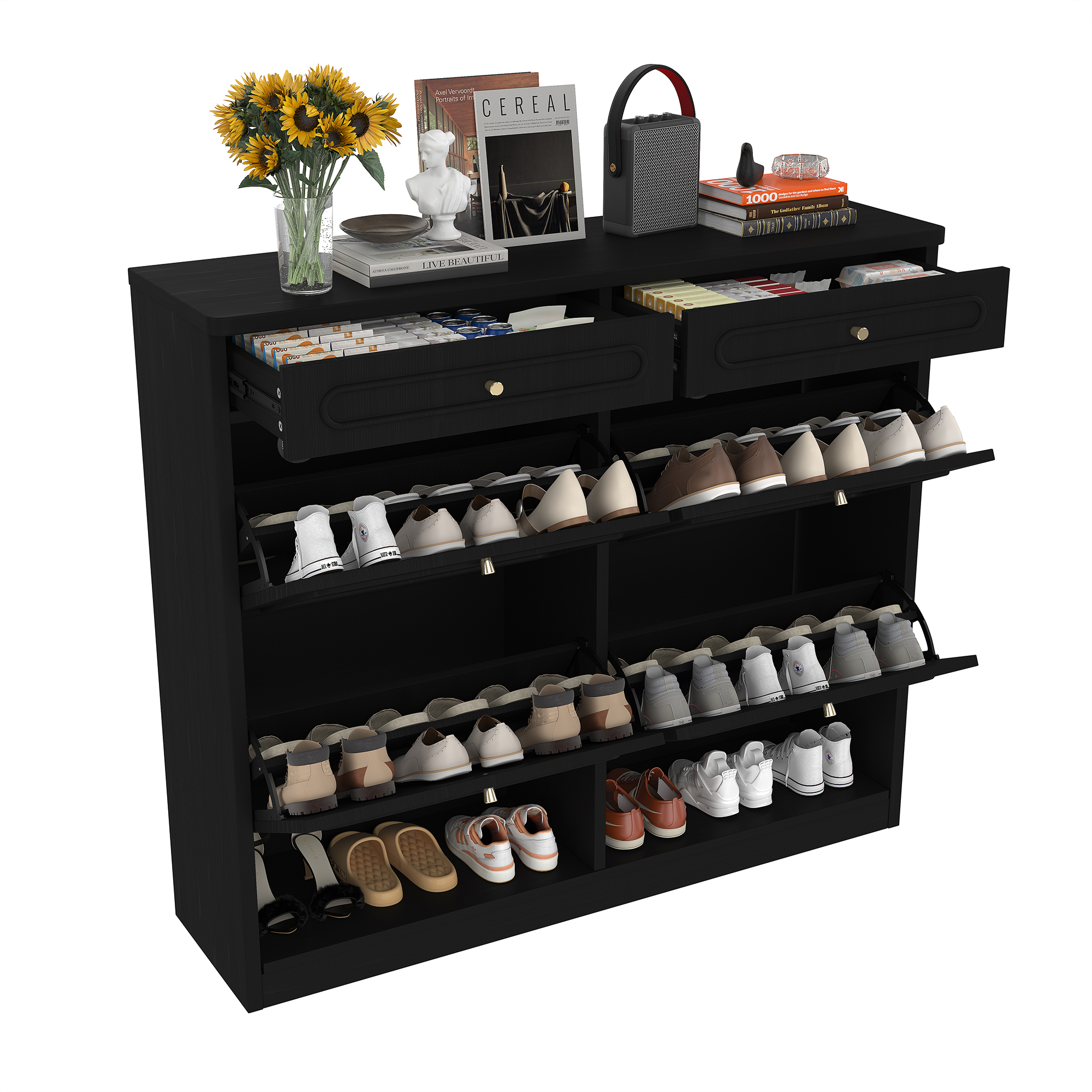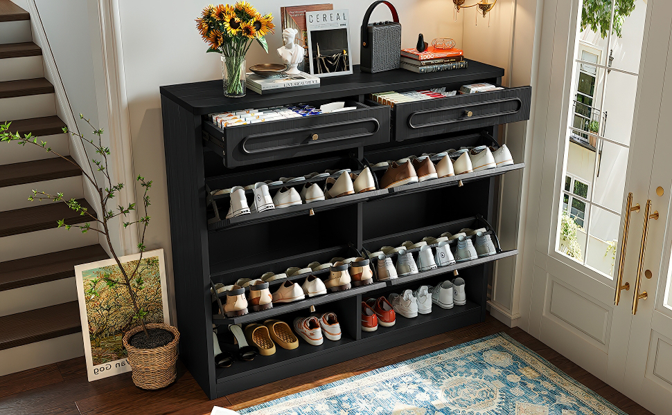 Keep your home organized and stylish with this Wooden Shoe Cabinet with 4 Flip Drawers and 2 Storage Drawers. Designed for modern living, this cabinet offers a smart classified storage solution that hides shoes neatly while keeping essentials within reach. The space-saving flip drawer design allows you to store multiple pairs of shoes without occupying excessive floor space, making it perfect for small apartments, condos or narrow entryways. Two additional top drawers provide convenient storage for everyday items like keys, wallets, shoe care tools or accessories. Finished in a clean farmhouse-style black, this shoe rack cabinet complements a wide range of interior styles—from modern to rustic. Built with sturdy engineered wood, it delivers durability, stability and smooth daily use. Whether placed in your entryway, hallway or bedroom, this functional and elegant shoe cabinet helps create a tidy, welcoming home.