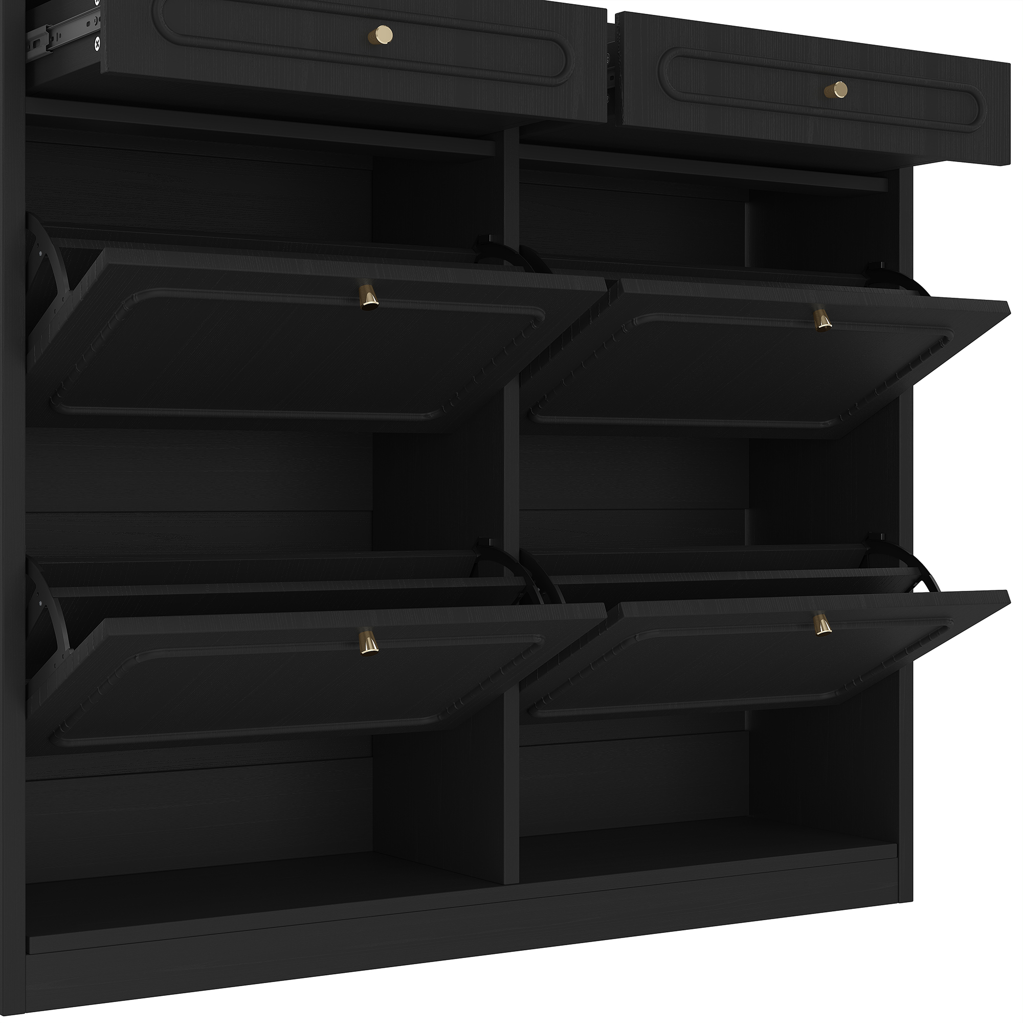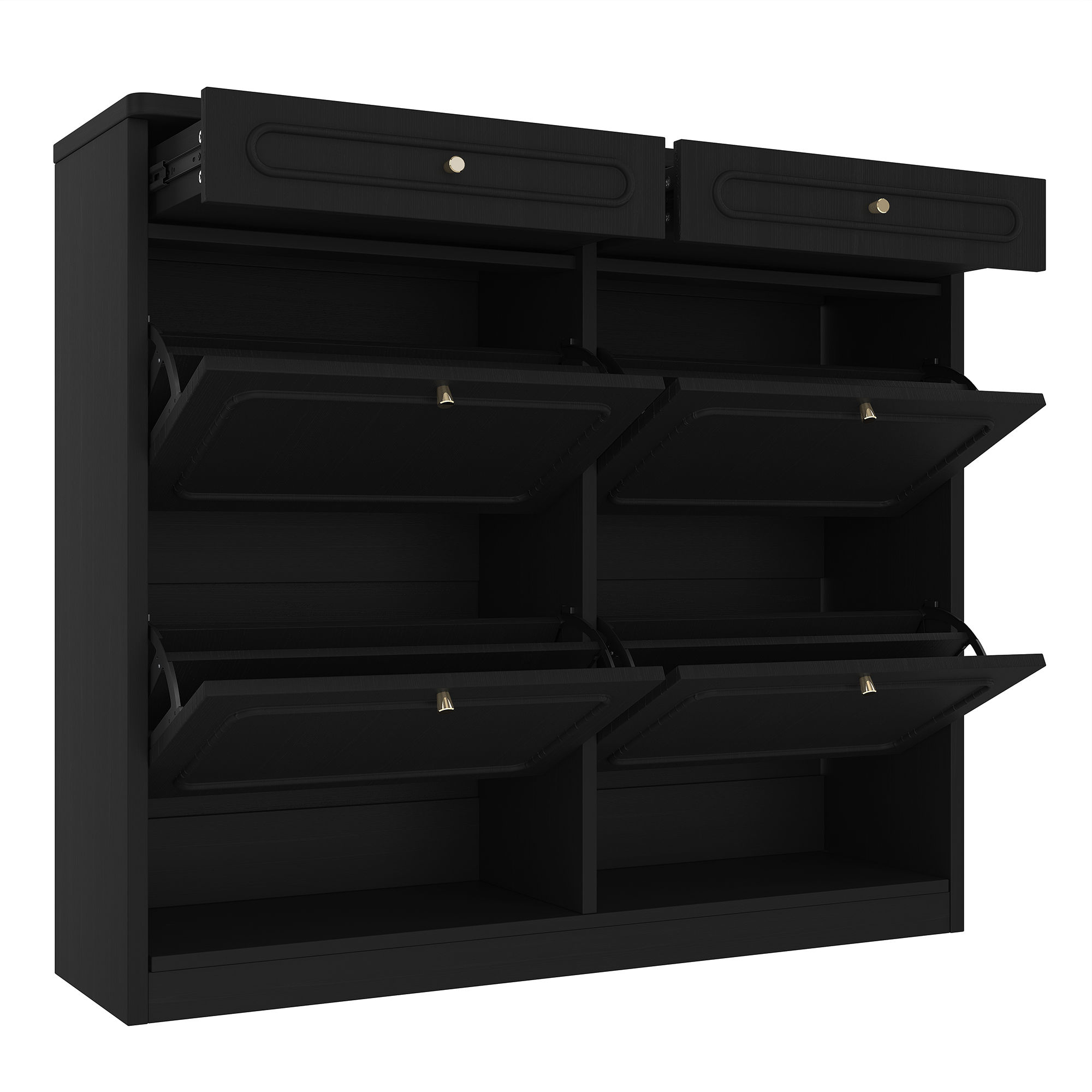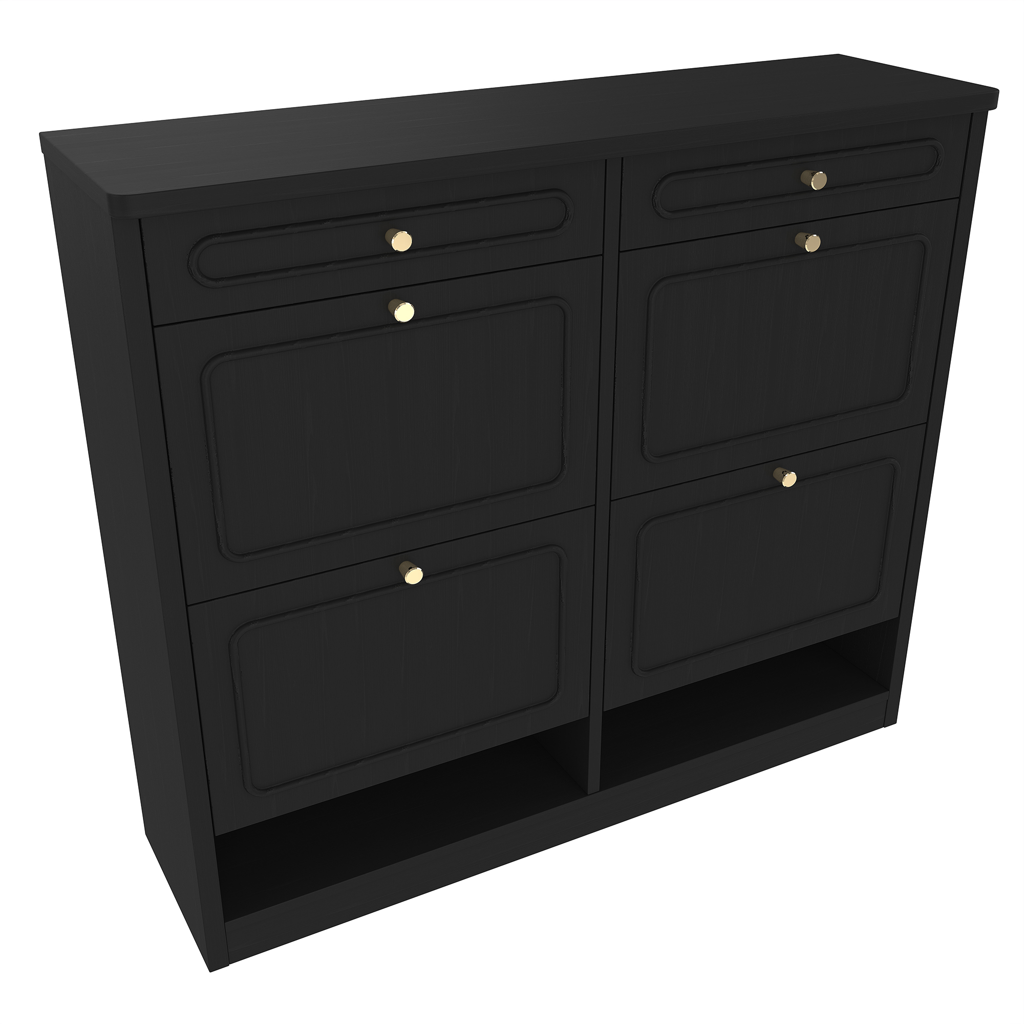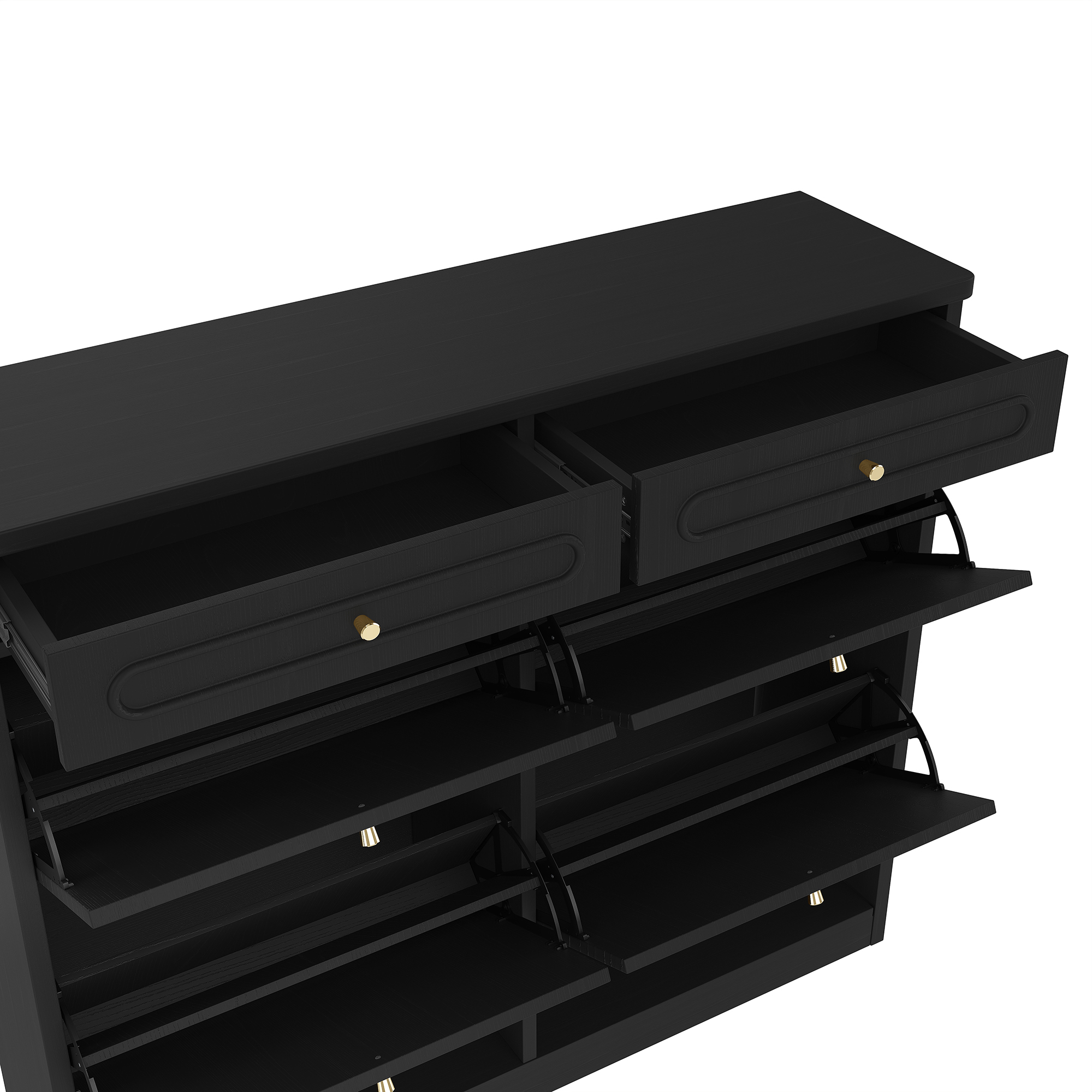 Keep your home organized and stylish with this Wooden Shoe Cabinet with 4 Flip Drawers and 2 Storage Drawers. Designed for modern living, this cabinet offers a smart classified storage solution that hides shoes neatly while keeping essentials within reach. The space-saving flip drawer design allows you to store multiple pairs of shoes without occupying excessive floor space, making it perfect for small apartments, condos or narrow entryways. Two additional top drawers provide convenient storage for everyday items like keys, wallets, shoe care tools or accessories. Finished in a clean farmhouse-style black, this shoe rack cabinet complements a wide range of interior styles—from modern to rustic. Built with sturdy engineered wood, it delivers durability, stability and smooth daily use. Whether placed in your entryway, hallway or bedroom, this functional and elegant shoe cabinet helps create a tidy, welcoming home.
